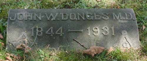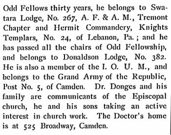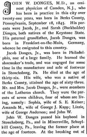 JOHN W. DONGES, druggist, physician, and surgeon, of Camden, was born at Stouchburg, Berks County PA, September 18, 1844. His father, Jacob Donges, emigrated from Germany shortly after the Revolutionary War, and settled in Berks County. His father, whose name was also Jacob, was married to Sarah Burkholder, and for many years carried on the shoemaking business of Stouchburg, employing a number of workmen, and also conducting a shoe store.