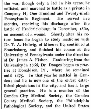 When seventeen years of age he enlisted in Company H, of the 129th Regiment of Pennsylvania Volunteers, in the nine months’ service, and, with his regiment, was assigned to the Army of the Potomac, under General McClellan. His regiment was present at the battle of Antietam only a few weeks after enlistment, but was not drawn actively into the engagement. In the battle of Fredericksburg, in the early part of December 1862, the 129th Regiment was brought into the thickest of the fight, and whilst charging the enemy, Dr. Donges received a dangerous wound by the explosion of a shell, causing a compound fracture of the skull. He was then sent to the hospital for surgical treatment, and, owing to entire disability for further military duty, caused by the wound, was discharged from the service on January 8, 1863.