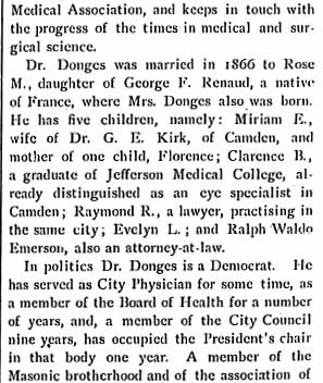 On December 22, 1866 Dr. Donges was married to Miss Rose Renaud, of Phildelphia. Dr. and Mrs. Donges have five children,- Miriam E., Clarence B., Raymond R., Evelyn L., and Ralph W.E.