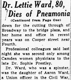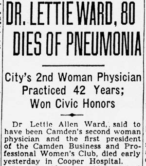 Dr. Lettie Anne Ward never married. A lifelong member of First Baptist Church in Camden, she died on March 22, 1939 at Cooper Hospital. She was buried at Harleigh Cemetery. In Dr. Ward's time, her fame as one of Camden's female physicians was second only Dr. Sophia Presley.