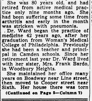 Dr. Ward was, according to her obituary, the second woman to practice medicine in the city of Camden. She practiced general medicine and specialized in ailments of the ear, nose, and throat (otorhinolaryngology). She delivered babies at a home for women Wright Avenue in Camden. Professionally, Dr. Ward was a member of the Camden County and Camden City Medical Societies; and the New Jersey Medical Woman's Association, and was the first president of the Camden Business and Professional Woman's Club.