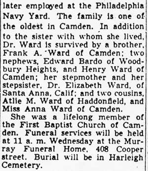 Besides Dr. Ward's father, who was a quite well known figure in Camden prior to his death in 1915, she numbered among her relatives E. Allen Ward, the contractor who in 1875, erected Camden's City Hall, which was completed and occupied the following year, and served as Camden's seat of government form 1876 through 1930.