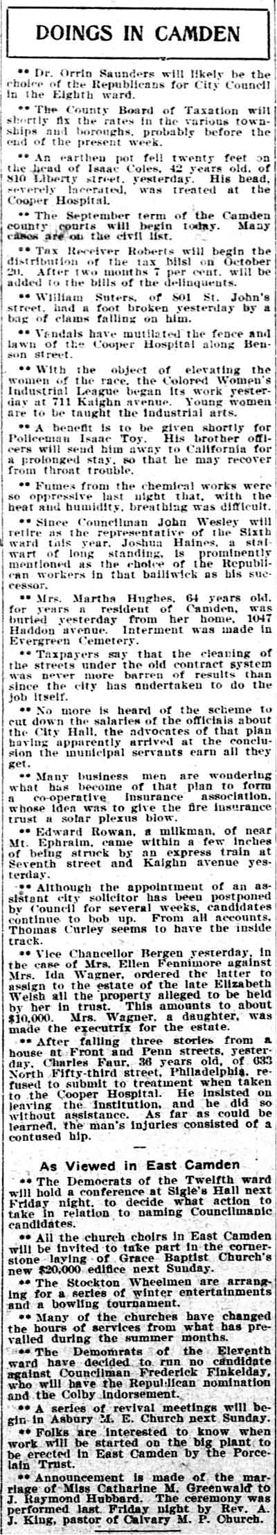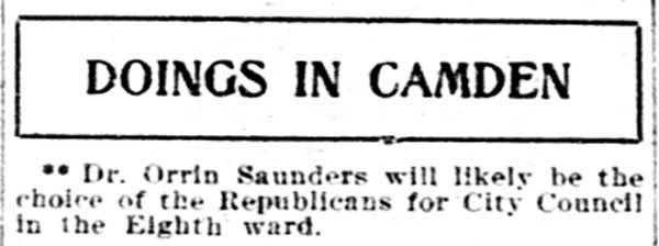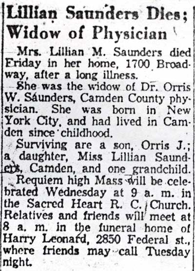 DR. ORRIS WILLIAM SAUNDERS was born in Camden NJ in 1876. He was the son of John and Anna B. Saunders. His father worked at a shoe factory in Camden, and soon went into the shoe manufacturing business for himself. In 1880 the family lived at 441South 4th Street. Orris Saunders graduated from Jefferson Medical College in Philadelphia in 1898. When the Census was taken in 1900, Dr. Saunders was living with his parents at 420 north 2nd street in North Camden. He married Lillian Marie Kelly after the 1900 census enumeration. After interning at the Red Bank Sanitorium,dr. saunders set up his medical practice in Camden's 8th Ward. He specialized in tuberculosis and general medicine. At the time of the 1920 census dr. saunders owned the home at 1700 Broadway, the corner of Broadway and Van Hook Street with his wife Lillian, sons and daughter, also named Orris and Lillian.