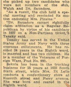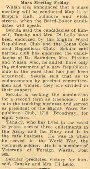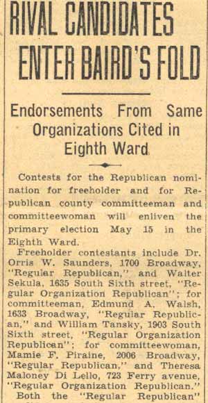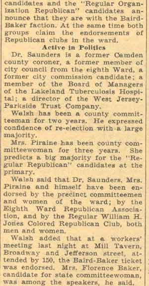Avenue. At the time of the 1930 Census, dr. saunders was still living at 1700 Broadway, His neighbors, the Jucketts at 1702 and the Rosevelts at 1704 broadway, would send their sons off in world war ii, John Rosevelt would be killed while serving in the Army overseas in 1945. In May of 1934, dr. saunders was nominated as the Republican candidate for freeholder in the 8th Ward, defeating Walter Sekula in the primary. dr. saunders was still living at 1700 Broadway when he passed away in 1946. His wife Lillian joined him on August 27, 1954. For many years, up until 2003, his home and offices at 1700 Broadway was the site of the Georgiana Ramsey Memorial Home, a facility for the elderly, maintained by the Union American Methodist Episcopal Church. |