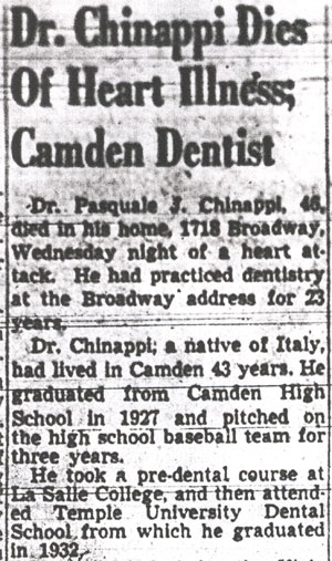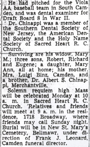 DR. PASQUALE J. CHINAPPI was the son of Mr. and Mrs. Salvatore Chinappi. During the mid-1920s the family lived at 639 Ferry Avenue. Pasquale J. Chinappi graduated from Camden High School in 1926. Among his classmates were future lawyer Frank Lario. While at Camden High he pitched for the school baseball team. After high school he attended college and received his dental doctorate in 1932. He started his dental practice at 1718 Broadway, where he also made his home. Dr. Chinappi's father died in Camden on May 3, 1934. His mother later was remarried to a Mr. Luigi Binz. Dr. Pasquale Chunappi died of a heart attack on May 20, 1953. He was survived by his wife Mary, sons Robert, Richard, and Eugene, and a daughter, Mary. He also left a brother, Dr. Albert Chinappi, of Merchantville, and his mother. |
