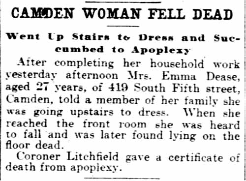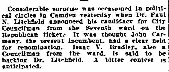 DR. PAUL NATHAN LITCHFIELD was born in Jersey City, New Jersey in 1873. After attending the University of Pennsylvania he graduated from Jefferson Medical College in 1895. He was a general practitioner and was affiliated with Cooper Hospital and the Lakeland Tuberculosis Hospital run by Camden County. Dr. Litchfield was a member of the Camden County Medical Society, the Camden City Medical Society; the American Medical Association, and the Philadelphia Medical Club. He also at one time served as Camden County's coroner. The 1900 Census shows Dr. Litchfield and his wife Rena at 1123 Kaighn Avenue. By 1906 he had moved to 1100 Kaighn Avenue, the corner of Mount Ephraim and Kaighn Avenues, where he had his medical practice and operated a pharmacy. He remarried in 1907, and was living with his wife Kirstine at the Kaighn Avenue address when the Census was taken in 1910, and when the 1914 City Directory was compiled. Dr. Litchfield died May of 1918. When the 1920 Census was enumerated his widow had moved to Philadelphia. By the mid-1920s Dr. Samuel S. Butler had acquired the property at 1100 Kaighn Avenue. Dr Butler would practice medicine and pharmacy at that address for many years thereafter. Dr. Litchfield was a member of Camden Lodge No. 293, Benevolent Protective Order of Elks. |