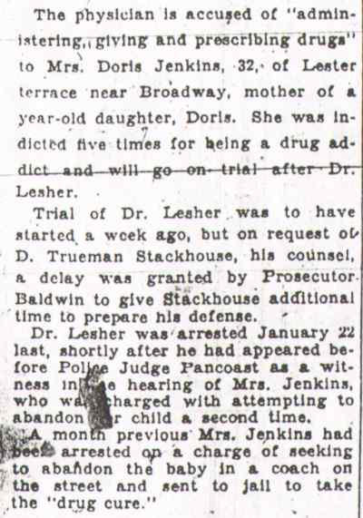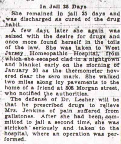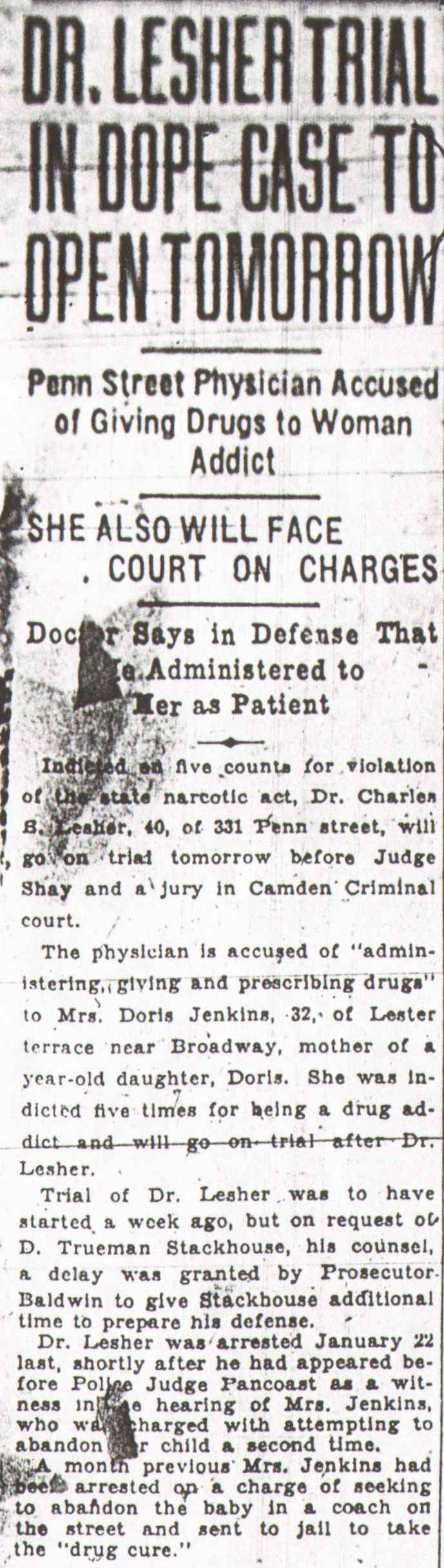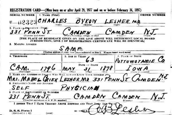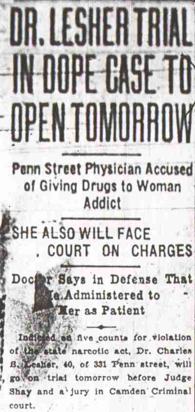 DR. CHARLES BYRON LESHER and his wife, DR. MABEL GRIER LESHER, practiced medicine and taught in Camden for many years. Charles Byron Lesher was born in Council Bluffs, Iowa on May 31, 1878, one of five children born to Charles H. and Edith Lesher. His parents, natives on Pennsylvania, returned there shortly after his birth. His father was afarmer. Charles Byron Lesher graduated from Northumberland PA High School in 1897 and from there went to Bucknell University, where he graduated in 1901. He studied medicine at the University of Pennsylvania School of Medicine, receiving his M.D. in 1908. He apparently married fellow doctor Mabel Grier, a classmate at Bucknell, shortly after the 1910 Census. Dr. Lesher interned at St. Agnes Hospital in Philadelphia, then spent the next two years as an intern at Cooper Hospital in Camden. Mabel Grier Lesher was born in Salem NJ in on July 30, 1880. She graduated from Salem High School in 1897, and like her husband, Bucknell in 1901, then on to John Hopkins University School of Medicine where she completed her studies in 1905. She interned at the Women's and Children's Hospital in Syracuse NY prior to her marriage. The Lesher's daughter, Mabel, was born in Syracuse on August 1, 1909. The family had settled in Philadelphia at 5624 Kingsessing Avenue when Dr. Charles Lesher registered for the draft in September of 1918, and were at 4606 Springfield Avenue by the end of 1919. They were in general practice and Charles Lesher was doing some surgery, and in 1918 completed some post-graduate work at the Polyclinic Hospital in Philadelphia. His wife received specialized training from the United States Public health Service in 1920. Between 1910 and 1927 the Drs. Leshers spent time in China with a hospital affiliated with the American Baptist missions. Dr. Lesher was director of the Chaoyany Dispensary and Kit-yang Hospital, Kit-yang, South China up until 1927. Dr. Mabel Lesher was Physician in charge of the Women's Clinic, Kit yang Hospital from 1922 to 1925; then was employed as physician by the Shanghai American School in Shanghai, China from 1925 to 1927. She also taught at the Women's Medical College at Shanghai in 1926 and 1927. The Lesher's returned to the United States in June of 1927 via England aboard the SS Berengaria. They eventually settled at 331 Penn Street in Camden. There daughter, Mabel, graduated from Camden High school and then, in June of 1933, from Bucknell University. Dr. Charles Lesher went back into practice. Dr. Mabel Lesher, after receiving training from the American Social Hygiene Association in 1927 and 1928, followed a career in education. She taught at Camden High School, Clara Burrough Junior High School, was professor of social Hygiene at New York University, Rutger's University, Trenton State Teacher's College; Temple University, in 1946 at the University of Utah, and the Teacher's College of Rhode Island. Besides being with his wife a member of the Camden County Medical Association, Dr. Charles Lesher was a member of the China Medical Missionary Association. Dr. Mabel Lesher was active with the American Social Hygiene Association. The author of several books and articles, she was, without a doubt, a pioneer in the field of social hygiene, what we today would call sex education. Dr. Charles Lesher gained a bit of unwanted notoriety when he was prosecuted on drug charges in 1930, for prescribing narcotics to a known addict. The charges were dismissed on the day of the trial. The Leshers were still at 331 Penn Street as late as 1947. Dr. Charles B. Lesher passed away in 1951. In 1958 Dr. Mabel Grier Lesher was award the Service to Humanity Award by the Bucknell University Alumni Association. Last a resident of Lewisburg PA , Dr. Mabel Lesher passed away in 1969. |