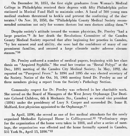 Dr. Presley served as gynecologist at the Camden City Dispensary, and succeeded Dr. Isaac Mulford as physician at the West Jersey Orphanage for colored children at 6th and Mechanic Streets. She also served on that institution's Board of Managers, and in 1894, as Second Vice-President under Lucy Cooper. In the late 1890s she was an instructor at the New Jersey Training School for Nurses. Dr. Presley was a member of the Camden County and Camden City Medical Societies, the Camden City Medical & Surgical Society, and the American Medical Association. Outside of her associations in the medical field, she was a member of the Woman's Club of Camden, the Woman's Park Association, and St. Paul's Episcopal Church on Market Street. In May of 1899 and and again in 1900 she was elected as to the Board of Directors of the Woman's Club of Camden.
