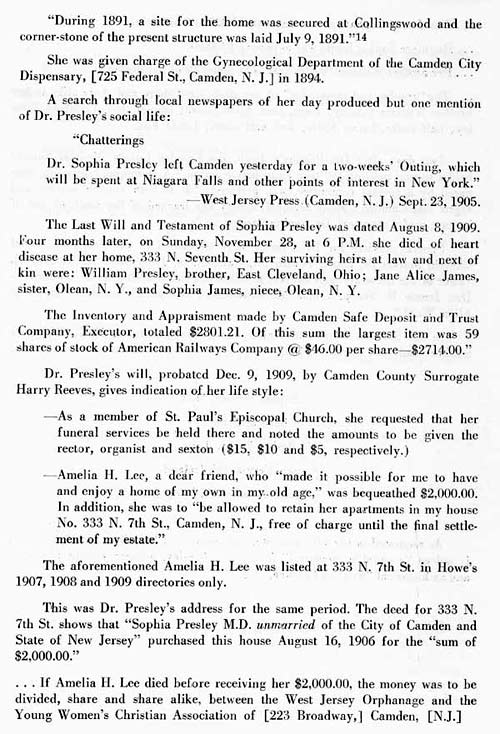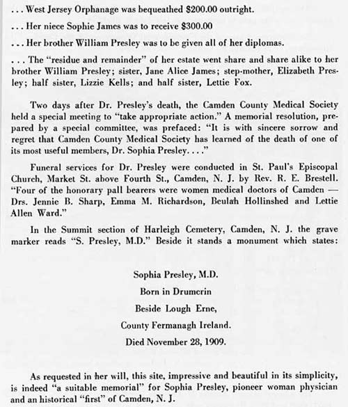 Dr. Sophia Presley passed away in 1909. At her death the Resolutions Committee of the Camden County Medical Society reported that after beginning her practice in Camden, "by her earnest zeal and ability, she soon had the confidence of many of our prominent families, and secured a large clientele under adverse circumstances.