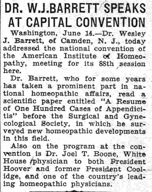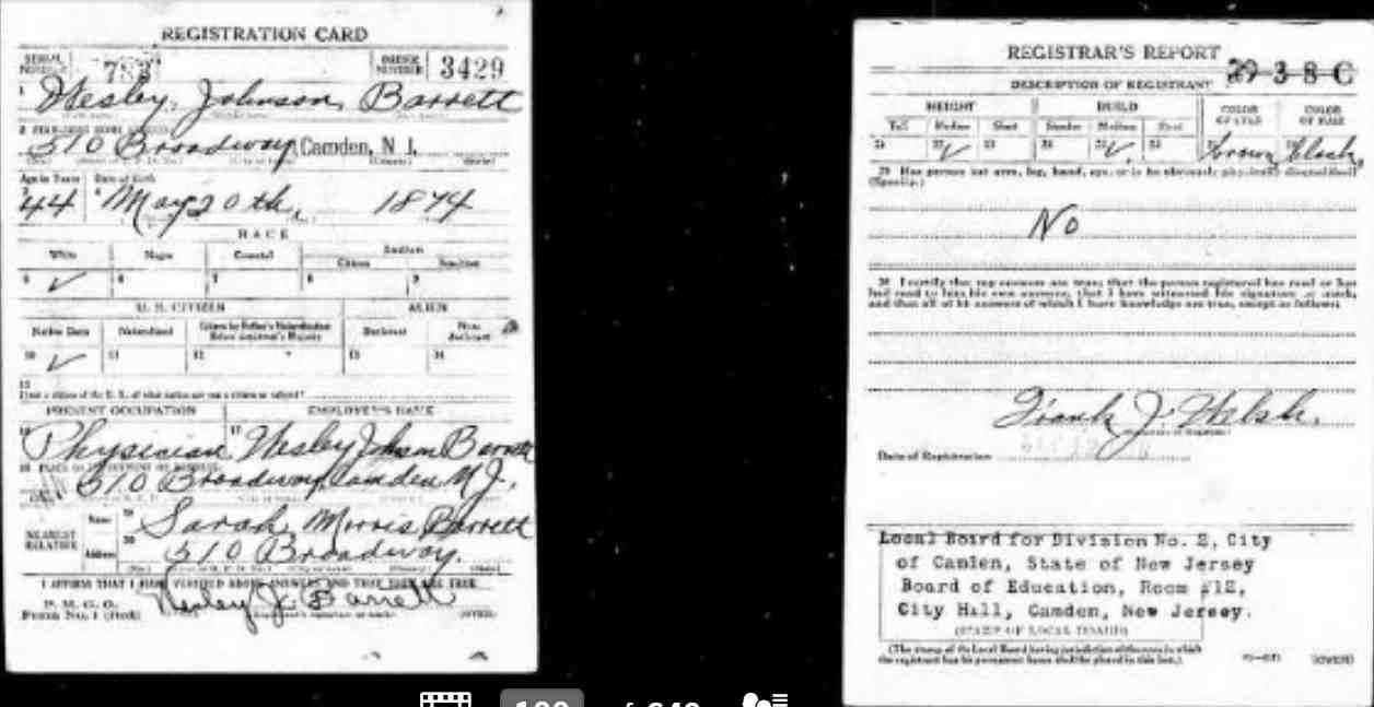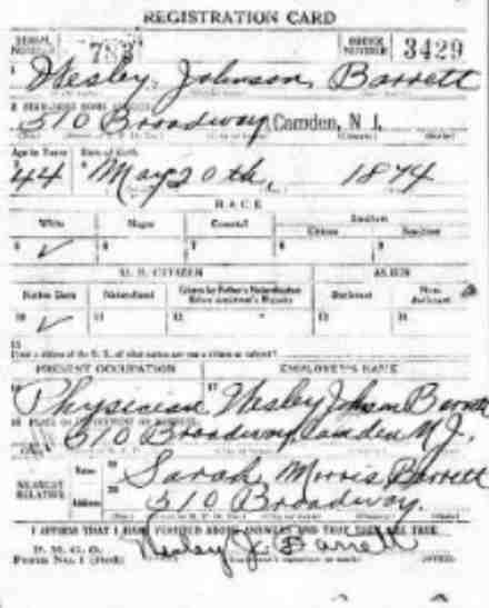 DR. WESLEY JOHNSON BARRETT was born in Guthriesville, Pennsylvania on May 20, 1874. He graduated from the Philadelphia College of Pharmacy and Science in 1896, and from Hahneman Medical College in Philadelphia in 1901. He first turns up in Camden City Directories in 1897, working as a drug clerk and living at 217 South 6th Street. The 1898 Directory has him living at 601 Berkley Street. Dr. Barrett appears in City Directories from 1902 to 1907 at 442 Broadway. From 1908 through the fall of 1918 his home and office was at 510 Broadway. Shortly before the 1920 Census he moved to 606 Cooper Street, where he kept his home and office at through 1924. By the time the 1926 City Directory was compiled, Dr. Barrett had moved to 217 Wayne Avenue in Haddonfield, New Jersey. He kept his medical office in Camden, at 517 Cooper Street. Dr. Barrett's primary concern was surgery. His career took him to the position of Chief of Surgery at West Jersey Hospital. Dr. Barrett was a member of the Camden County Medical Society, Camden City Medical Society, American Medical Association, West Jersey Medical Society, and the Homeopathic Society of New Jersey. He was also Fellow of the American College of Surgeons. Dr. Barrett was president of the Camden County Medical Society in 1930 Dr. Barrett was also involved with the Camden Copper Works, originally on South 5th Street, at Washington Street, and later at 559-609 South Second Street. The business was incorporated under the laws of New Jersey in 1912 for $50,000 fully paid, with Bernard Ahlberg, the founder, as president and manager; Dr. Wesley J. Barrett, secretary, and Walter E. Ahlberg, the founder's son, as treasurer. These also constituted the board of directors. Dr. Barrett was married to Sarah M. Steedle. They had three daughters, Frances, Grace, and Ruth. Dr. Barrett passed away in 1934. Mrs. Barrett was still living at the Haddonfield address as late as 1947. |