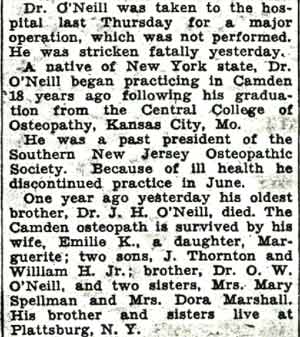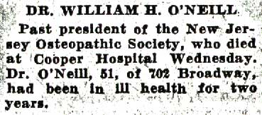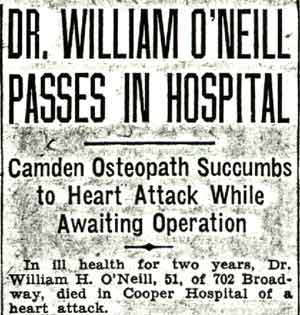 DR. WILLIAM H. O'NEILL was born around 1885 in New York State. He married his wife Emilie around 1905, when he was 20 years old. He entered the medical field late in life, graduating from the Central College of Osteopathy in Kansas City MO around the time of World War I. He came to Camden in 1918 and began his practice. By 1920 Dr. O'Neill had married. He was then living at 714 Market Street in Camden, with wife Emily, daughter Marguerite, and sons J. Thornton and William H. O'Neill Jr. During the 1920s Dr. O'Neill purchased the building at 702 Broadway, where he lived and practiced medicine. During his time in Camden he served as President of the South Jersey Osteopathic Society. Dr. O'Neill fell ill in 1934, and ill-health caused him to abandon his medical practice. Taken to Cooper Hospital for major surgery, he died of a fatal heart attack while awaiting surgery on August 5, 1936 at the age of 51.