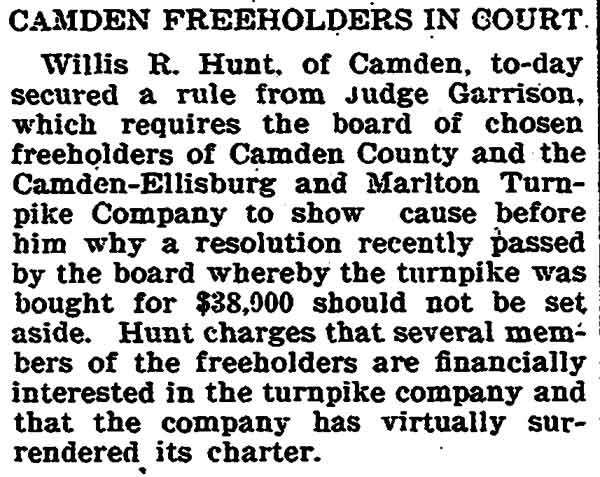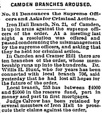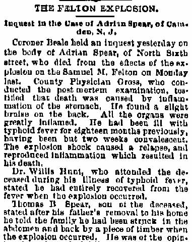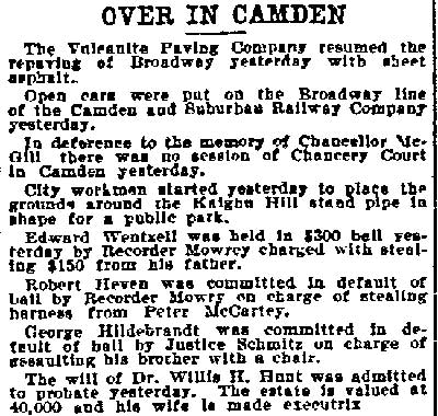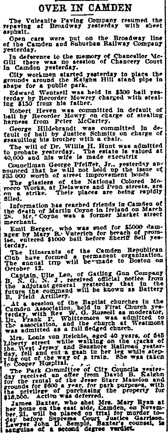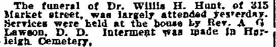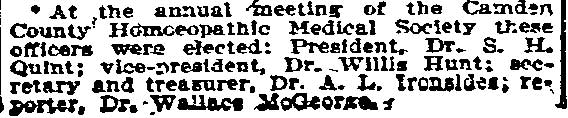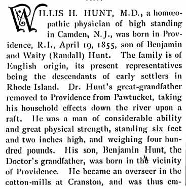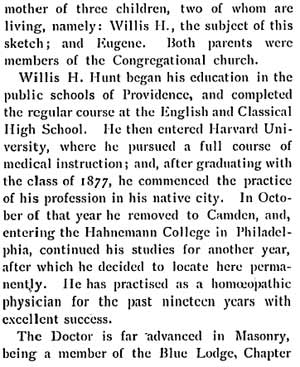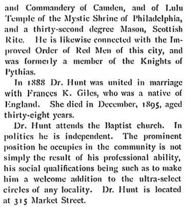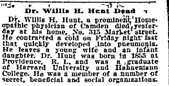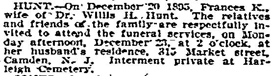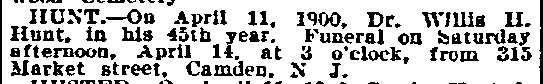DR. WILLIS H. HUNT was born in Rhode Island on April 19, 1855. His older brother, Dr. Henry F. Hunt, settled in Camden around 1864, and was successful, well known, and much respected practitioner, whose home and office was at 511 Cooper Street.. He began the study of medicine in Providence under Dr. Elmer Eddy. Entering Harvard in 1874, he graduated in June of 1877. In the fall of 1877 he came to Philadelphia and entered Hahneman College in Philadelphia. Prowell's History of Camden County, New Jersey states that Dr. Hunt withdrew after on year due to ill-health. Dr. Willis H. Hunt soon came to Camden and commenced the practice of medicine in locally 1878. By 1887 he had established residence and practice at 315 Market Street. He was a Mason, a member of the Knights of Pythias, and of the Improved Order of Red Men. In 1888 Dr. Hunt married Frances K. Giles, She passed away in December of 1895. A fey years later he again married. His second wife was the former Mary Fidell. A daughter, Ruth, was born in November of 1899. Sadly, Dr. Willis Hunt passed away in 1900, and was buried at Harleigh Cemetery in Camden, next to his first wife, Frances. Besides his wife and daughter, Willis Hunt was survived by two sons born to his his first wife, Willis and Eugene. Mary Fidell Hunt subsequently moved to 424 North 6th Street in Camden, where she resided at with her widowed mother Lydia and brother Charles when the Census was taken on June 7. A few years later she was in New York, where she met and married Dr. Frederick Cook, the then-famous Arctic explorer, whose claim to have been the first to reach the North Pole were discounted during his lifetime, but have gained considerable support in more recent times. |