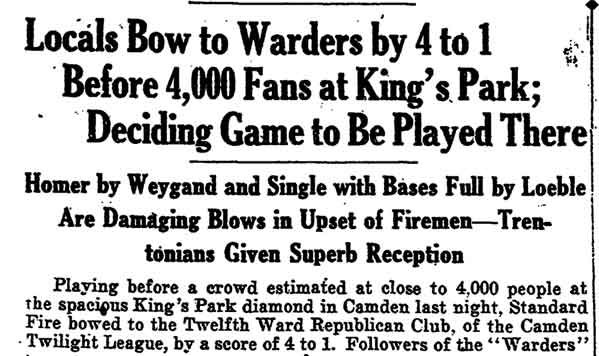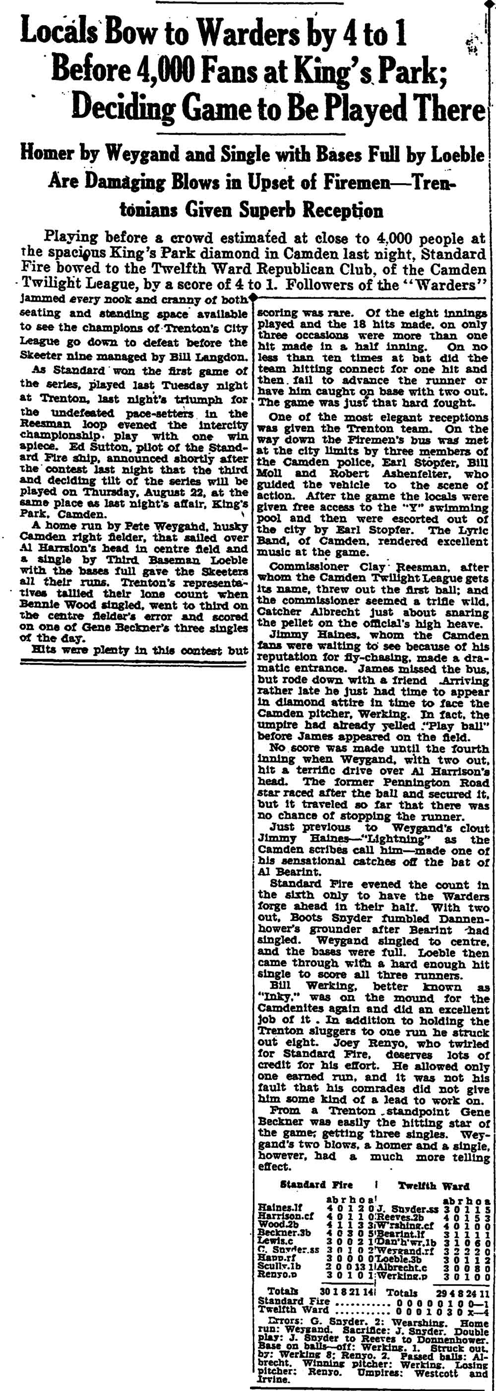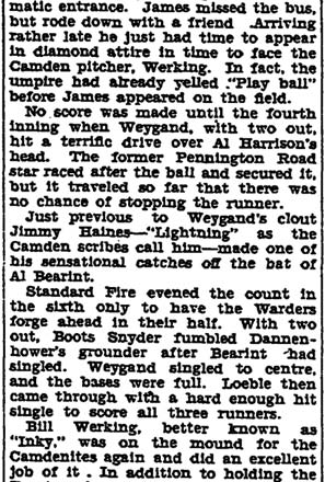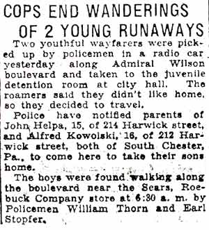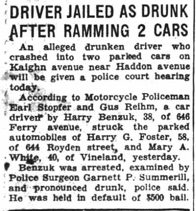 HALT FLIGHT AFTER CAR HITS COP Four men were arrested amid revolver shots after a Camden policeman was knocked down by a police car during a raid yesterday afternoon. Acting on orders of Commissioner Mary W. Kobus, who is continuing her drive to rid the city of speakeasies, three policemen and two detectives surrounded the home of James Ford, colored, at 1124 South Ninth street, shortly. before 3 p. m. Patrolmen Edward Shapiro and Thomas Kauffman arrived in a radio car. So did James Brown and John Houston, two colored detectives. Patrolman Earl Stopfer arrived on foot. Three policemen went to the back door. Kauffman stayed in the radio car at the front. Shapiro knocked at the front door. The policemen at the rear were ahead of those opt front. As a re-sult four men ran out through the front door .and bowled over Shapiro. The man in the lead, who later was identified as Wilbur "Lackey" Davis, of 821 Mt. Vernon street, raced up the street, a quart bottle of liquor in hand. Kauffman had driven his radio car behind another machine. He started the engine and attempted to back out to give chase. Shapiro ran behind the car and as he did, the machine struck him, knocking him into the middle of the street. Prone, Shapiro drew his revolver and opened fire on Davis. Three shots were fired in the air. Two others were closer to the fugitive, who halted. With the sound of shooting, the other three men yielded to the assembled policemen. They gave their names as Ford, Herman Hopkins, 21, of 1124 South Ninth street, and Harry McLane, 29, of 746 Kaighn avenue. All will be arraigned today. Ford, Hopkins and McLane will be charged with violating the state A.B.C. act. In addition, Davis will be charged with resisting arrest. Patrolman shapiro was hurt but slightly." |
