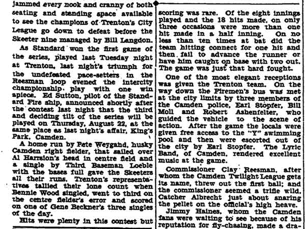 EARL STOPFER was born in Philadelphia PA on March 29, 1899. In 1910 he was living with his grandmother, Elanine Basert. By the time he registered for the draft on September 12, 1918, he had married. Earl and Alamanda Stopfer then lived at 827 East Tioga Street in Philadelphia. He was then working as a forge machine operator for the Midvale steel and Ordinance Company. When the Census was enumerated in January of 1920 the young couple lived at 246 Division Street with their four month old son Earl W. Stopfer. Earl Stopfer was then working at a leather factory. A daughter named Frances would follow by 1922. When the 1924 Camden City Directory was compiled, the Stopfer family lived at 246 Burns Street in the Poets Row section of North Camden. On April 25, 1924 Earl Stopfer became a member of the Camden Police Department along with Thomas Kauffman. By 1929 and into the 1930s Earl and Alamenda Stopfer owned a home at 114 South 27th Street in East Camden. In the early 1930s Earl Stopfer was at times partnered with Officer William Thorn. Around 1935 he began working with Officer George F. Jefferis. During World War II the two were widely known throughout the city for their work in the sale of $4,000,000 in war bonds, and for guiding and instructing public and parochial school safety patrols. During that period the two men organized safety patrols in 38 schools with a membership of 1058. The two patrolmen in 1948 ago completed a colored, sound motion picture, "A Plan For Safety", financed by the Atlantic Refining Co. Since then the film has been shown throughout the United States, Canada, Hawaiian Islands, and in the United Kingdom. The picture was filmed in Camden, with the two policemen and Camden schoolchildren as characters. Among the cities which have announced they have organized safety patrols along the lines shown in the picture are Vineland, Millville, Akron OH, Cincinnati OH, Springfield MA, Memphis TN, Washington DC, Bloomington IN, Salt Lake City UT, Topeka KS, Richland WA, Boston MA, Lancaster PA, Honolulu HI, and Toronto, Canada. The film has been shown before hundreds of civic, social, and service groups, and parent-teacher associations. It relates various duties and requirements for school safety patrol members and shows them in correct activities in the event of fire alarms and drills, operation of children's courts, holding of safety meetings, care of children on streets, and holding of program planning meetings. In the 1940s Earl and Alamenda Stopfer moved to a newly-built townhouse at 15 North Dudley Street. He was still living at that address as late as the fall of 1956. Earl Stopfer does not appear in the 1959 New Jersey Bell Telephone Directory. |