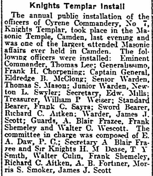 Philadelphia inquirer March 9, 1915 Cyrene Commandery No. 7, Knights Templar Thomas Lee |