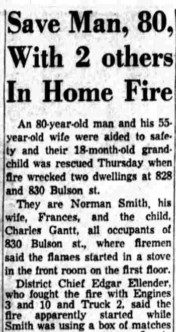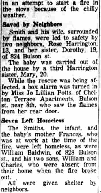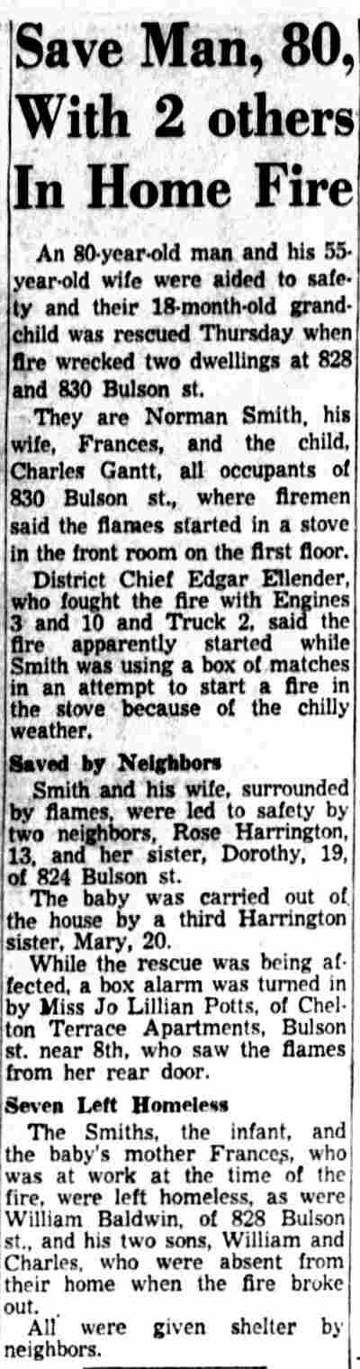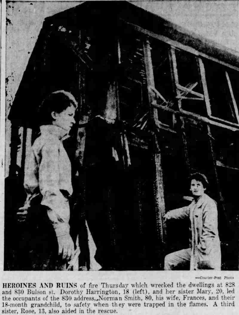HEROINES AND RUINS of fire Thursday which wrecked the dwellings at 828 and 830 Bulson Street. Dorothy Harrington, 18 (left), and her sister Mary, 20, led the occupants of the 830 address, Norman Smith, 80, his wife, Frances, and their 18-month grandchild, to safety when they were trapped in the flames. A third sister, Rose, 13, also aided in the rescue. |