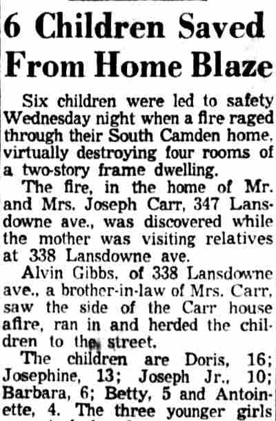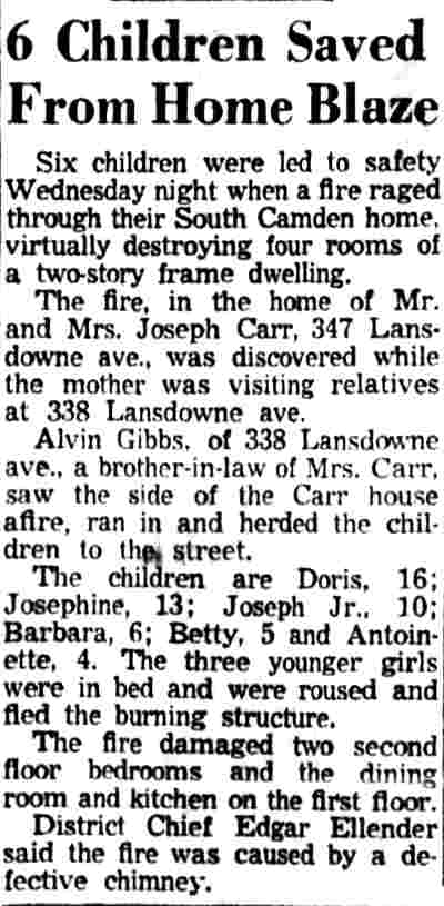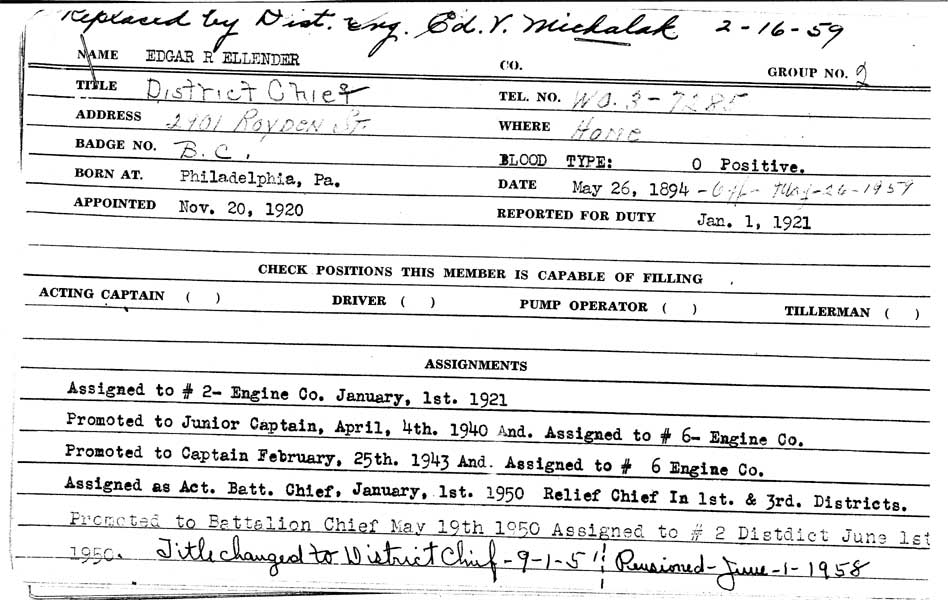 EDGAR ROY ELLENDER SR. was born in Philadelphia on May 26, 1894 to Frank A. and Caroline "Carrie" Ellender. At the time of the 1900 Census the family resided at 1009 Carlton street in Philadelphia PA. Father Frank and son Frank H. Ellender are listed as "officers" on the census sheet for that year, and considering his father's later employment it is probable that they were policemen. Also at home were sisters Hettie, Sadie, and Carrie Ellender. Edgar was the youngest child then at home. The Ellenders were living in West Deptford NJ when the census was taken in 1910, at the home of Edgar's sister Sadie and her husband, Jesse Darlington. When the United States became involved in World War I he enlisted in the Navy, his service commencing on April 4, 1917. He left his wife Martha and daughters Martha and Dorothy when he answered his nation's call. A son, Edgar Jr., was born in December of 1917. Edgar Ellender Sr. was discharged from the United States Navy on March 11, 1919. His rank was Fireman First Class when he was discharged. He returned to his wife and child after his service was completed. When the census was taken in January of 1920, the Ellender family was renting a home at 531 Fulton Place . Only five doors away, at 541 Fulton Place , another Camden fire fighter, Robert M. Coffman, resided. 531 Fulton Place would remain the family home through at least April of 1930. Another child, daughter Edith, had joined the family. Edgar Ellender Sr. was then working as an electrician for a trolley car line. Interestingly enough his father, Frank A. Ellender, was Marshall of Westville NJ at the time, despite being 69 years old at the time. Brother Frank H. Ellender and sister Hettie Ellender Rhoades also lived in Westville, young Frank then a guard at a United States Government building. Edgar Ellendaer was still living at 531 Fulton Place as late as 1931. Edgar Ellender was appointed to the Camden Fire Department on November 20, 1920. He reported for duty with Engine Company 2 on January 1, 1921. He remained with Engine Company 2 until April 4, 1940 when he was promoted to junior captain and assigned to Engine Company 6 at Front and Linden Streets. On February 25, 1943 he was to promoted to Captain. The 1940 Camden City Directory shows Edgar Ellender and his family living at 157 North 32nd Street in East Camden. By the time the 1943 edition was compiled Edgar Ellender and his wife were living at 2901 Royden Street, where they remained until his retirement in 1958. On January 1, 1950 Edgar R. Ellender was promoted to Acting Battalion Chief. He served as the relief chief for the 1st and 3rd Fire Districts until May 19, 1950 when his promotion was made permanent. Chief Ellender he was was posted to the 2nd Fire District on June 1, 1950. He served in this capacity until his retirement on June 1, 1958, the Battalion Chief title having been changed to District Chief in 1951. When Chief Ellender retired he was replaced as District Chief by Edward V. Michalak, who in turn was elevated to Chief of Department in 1965. Edgar Roy Ellender Sr. passed away on November 29, 1967. He was buried on December 4, 1967 at Beverly National Cemetery in Beverly NJ next to his wife Martha, who had died in November of 1956. |