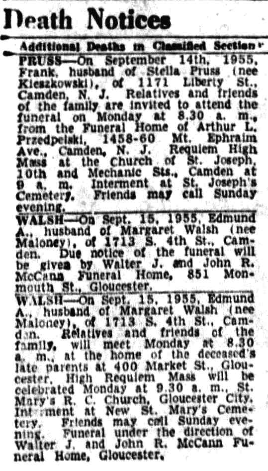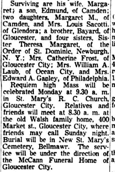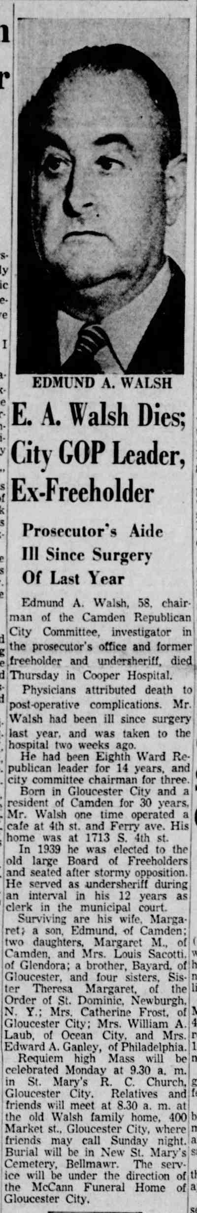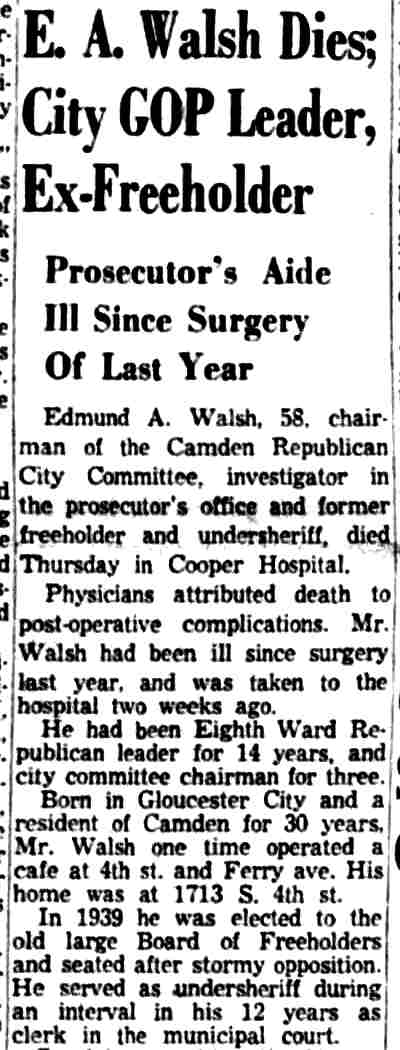 Edmund A. Walsh was born in New Jersey around 1896. He was married to his wife Margaret in the early 1920s. By 1924 he was living at and managing Michael J. Maloney's service station at 1600 Broadway. Maloney also had a bar at that location. Edmund Walsh was a partner in the business by 1927. Edmund A. Walsh also operated the saloon at 1600 Broadway in 1928, and continued in that business through the first half of 1930. At the time of the 1930 census he was still operating this bar. His family, which included son Edmund Jr. and daughter Betty Ann, lived at 1633 Broadway. By 1931 he was concentrating his efforts at the Ferry Avenue bar. In 1932 Edmund A. Walsh was elected Republican county committeeman from Camden's 8th Ward. He was reelected during the bitterly contested elections of May 1933, defeating mikey brown by only four votes in a possibly rigged election, and May 1934. He replaced Ferdinand J. Larkin on the Camden County Board of Freeholders after Larkin's death in September of 1939. He later took a a position as the secretary at the Camden City Municipal Court, also known as the Police Court, holding that post for twelve years. He also served as a Camden County undersheriff for three years while holding down the Police Court post. In April of 1952 Edmund A. Walsh was elected chairman of the Republican Party City Committee. He was re-elected in 1953, 1954, and 1955. By 1947 Edmund Walsh was living at 600 Ferry Avenue. He was by the working He later moved to 1713 South 4th Street. Edmund Walsh passed away on September 15, 1955. |