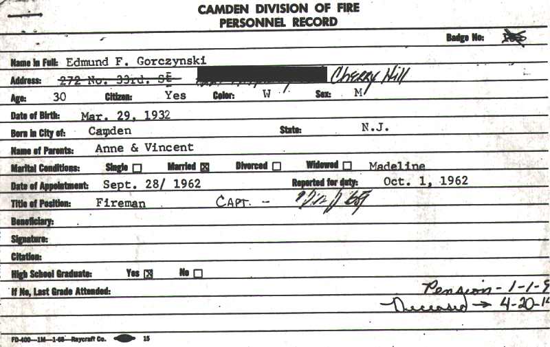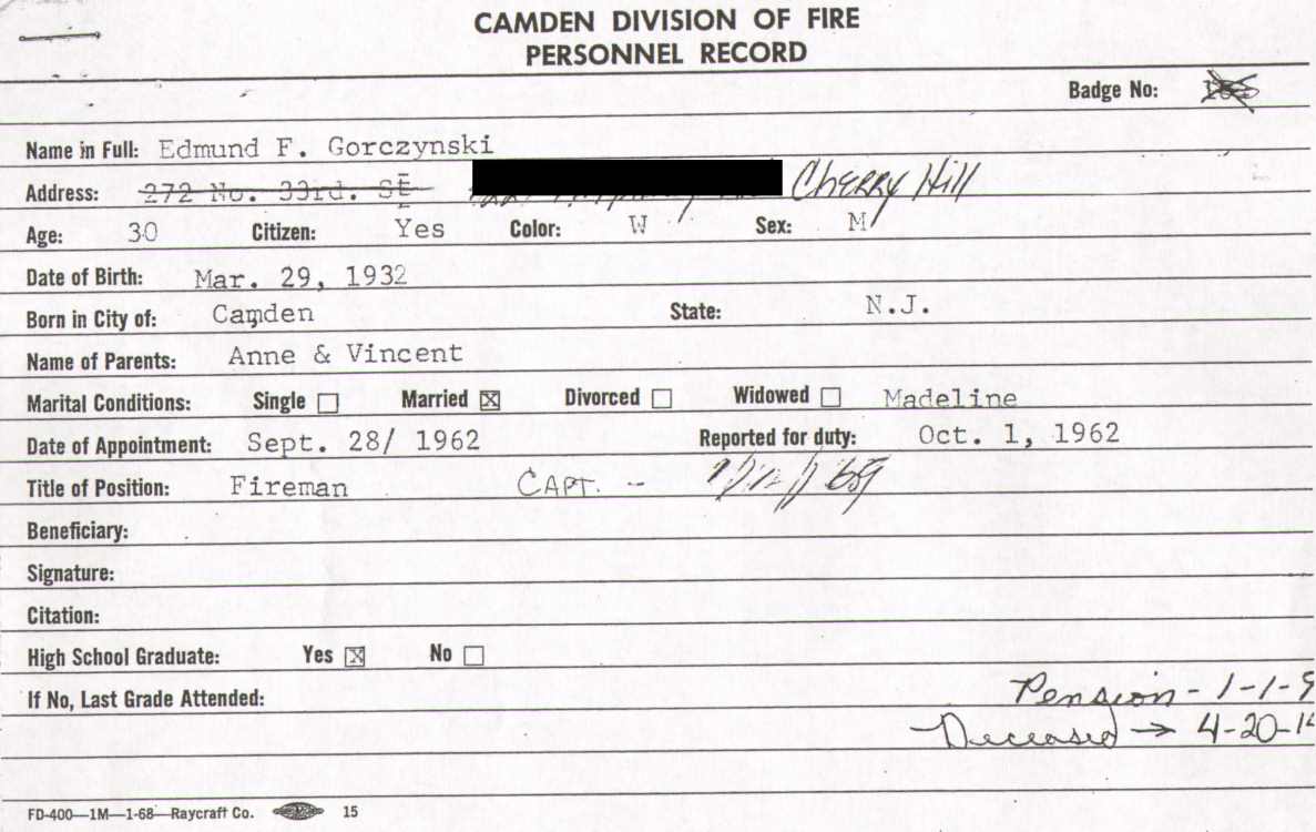 October 1, 1962. In January of 1969 he was promoted to Captain. He retired on January 1, 1990. Prior to Camden Camden lifting its residency requirements for firefighters in the 1970s, Edmund F. Gorczynsi and family lived at 272 North 33rd Street in East Camden. The family subsequently moved to Cherry Hill, New Jersey, where oldest son Michael was a star football player in the mid-1970s at Cherry Hill High School East. Edmund F. Gorczynski passed away on April 20, 201 4, survived by his wife, sons, and five grandchildren. |