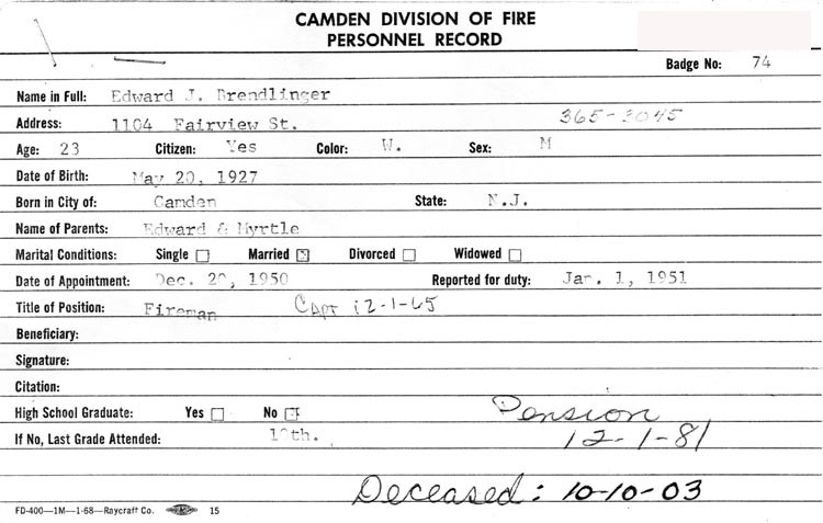 CAMDEN FIRE DEPARTMENT UNIFORMED PERSONNEL INDEX