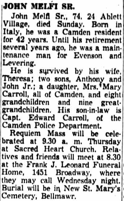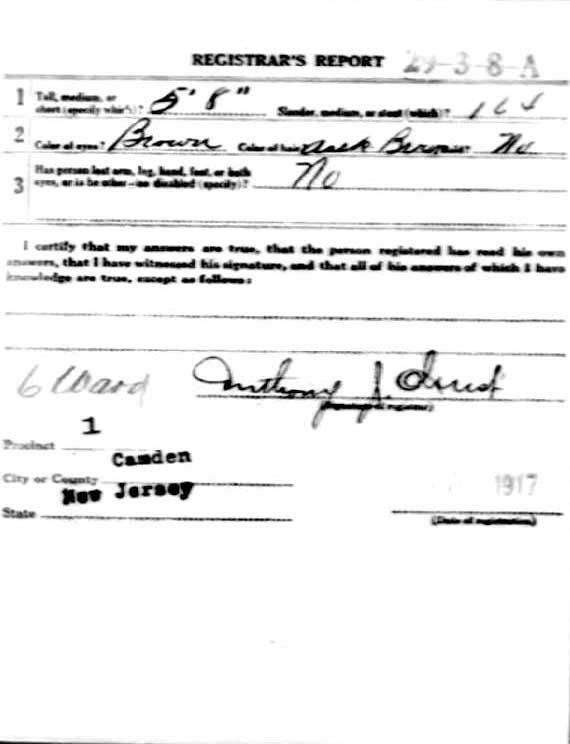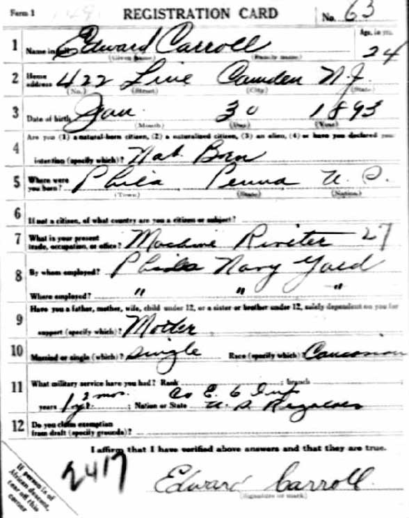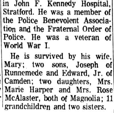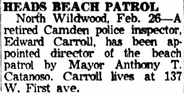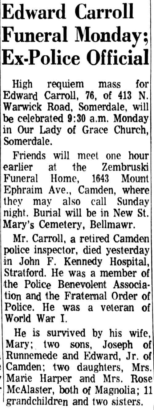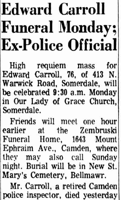 EDWARD CARROLL was born in Philadelphia, Pennsylvania on January 30, 1893. When he registered for the draft on June 5, 1917 he was still single and living with his mother at 422 Line Street. He then was working as a riveter at the New York Shipbuilding Corporation shipyard. Edward Carroll was appointed to the Camden Police Department on July 14, 1922. The 1929 City Directory shows Edward Carroll and his wife Mary at 1037 South 5th Street in South Camden. The 1930 Census shows that the Carroll's were then the parents of four children, Edward, Marie, Joseph, and Rose Carroll. By April of 1930 Edward Carroll had been promoted to Sergeant and was Captain by 1949. In the interim period between the time when Chief George W. Frost left the department and Chief Gustav A. Koerner was appointed, Edward Carroll was the second-most senior officer in the city, serving under Acting Chief Samuel E. Johnson. He was promoted to inspector on November 29, 1949. Inspector Carroll was still on the job as late as January 16, 1957. By February of 1959 he had retired and moved to Wildwood, New Jersey. Last a resident of Magnolia, New Jersey, he passed away on October 9, 1969. |