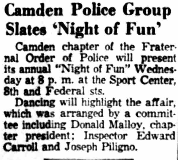 POLICE, FIRE GROUP TO HONOR WALLACE The Camden Police and Firemen's Association will hold an informal buffet supper tonight at its headquarters, 1175 Whitman Avenue, for Bruce A. Wallace, counsel for the association and member of the Delaware River Joint Commission. Invitations have been issued to police chiefs throughout the county, as well as to other officials. Patrolman William Schriver, president of the association, is chairman of the committee. Other members are Fire Captain Winfield Leviseur, Sergeant Edward Carroll, and Patrolman John Kowal, William McGrath and Arthur Batten. |