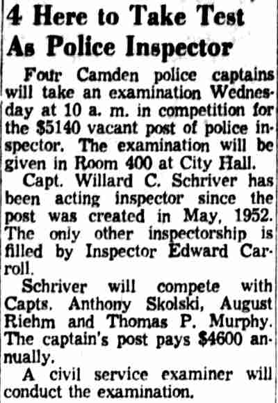 GETS WARD'S JOB AS KOBUS ORDERS COP SHAKEUP SHAW MADE ASSISTANT IN PLACE OF KOERNER In a shakeup of Camden police officials yesterday afternoon Lieutenant Samuel E. Johnson was named acting chief of detectives by Commissioner Mary W. Kobus, director of public safety. Lieutenant George A. Ward, who has been in charge of the detective bureau for a year, was transferred to take Johnson's place in charge of headquarters. Detective Louis Shaw was made assistant to Johnson, replacing Detective Sergeant Gus Koerner. Koerner was transferred to the Second District, for radio car and street duty. The new order became effective at 4:00 PM yesterday Police Chief Arthur Colsey announced the changes in the bureau after a two-hour conference with Commissioner Kobus yesterday afternoon. Maurice Di Nicuolo, who has been an acting detective, was transferred to the First Police District, with former Acting Detective Clifford Del Rossi returning to his old post in the detective bureau. In the only other transfer announced, Sergeant Harry Newton was switched from the First Police District to the Third, with Sergeant Edward Carroll going from the Third to the First. Although no other changes were made public, it is believed yesterday’s are a forerunner of numerous shifts to be made today or early next week.’ “These changes are being made for the good of the service,” Commissioner Kobus declared. “There will be other transfers of officers and men so that all the police may familiarize themselves with all the branches of the department.” Lieutenant Johnson was a appointed a policeman on January 1, 1910. After 10 years as a patrolman, he was promoted to a detective, where he made a splendid record. On November 28, 1928 he was made a sergeant, and again promoted on April 8, 1930, when he became a lieutenant. Ward was appointed a policeman on August 2, 1917, promoted to detective January 1, 1927, sergeant November 14, 1928 and lieutenant on January 24, 1930. Johnson was a detective sergeant when former Police Chief John W. Golden was head of that bureau, but later was transferred to police headquarters. Ward has been in and out of the detective bureau several times. He served for a time as the commander of the First District and later was ion charge of the police headquarters on the 12:00 midnight to 8:00 AM shift. He was a political lieutenant of former Public Safety Director David S. Rhone. |
