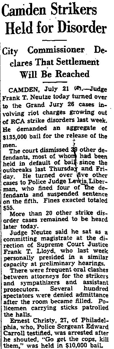 DENIES THIEVES TOOK SLOT MACHINE Lewis Shectman changed his story in police court today and declared that it was only a box of cigars, not a gambling machine that was stolen from his store, 708 Broadway, yesterday by two bandits. Police Court judge Bernard Bertman characterized Schectman as a prevaricator. Shectman denied statements published ion the Evening Courier yesterday, in which he and his wife and daughter related in detail how two men had carried away a gambling machine in an automobile after losing $2 playing the machine. William Gaffney, Evening Courier reporter, was called to the stand and repeated the facts published in yesterday’s paper. “I cannot help but believe you are lying”, Bertman said to Schectman. At the same time Bertman intimated that he would recommend a further investigation of the matter by County Prosecutor Wescott before putting the evidence before a grand jury. Denies Stealing ‘Cigars’ Schectman appeared in Court today against two men the police arrested in the case The defendants are Walter S. Nowak, 22 years old, 442Jackson Street and Martin Bertherlet, 25 years old, 1218 Pavonia Street. Each was held in $500 bail for the Grand Jury after Samuel P. Orlando, counsel for the two men, had waived a hearing. Orlando, after the hearing today, stated that both men deny the charge of stealing the cigars. He would not comment on the case further, however. Nowak was caught after a two-mile chase through the streets. of Camden yesterday by Schectman and Frank Helm, 2909 Stevens Street, who offered his car as Shectman cried “Help! Robbers!” in front of his store. Nowak was turned over to Patrolmen nathan petit and Edward Carroll of the Second District patrol crew. Both Are Identified Berherlat was arrested. Police said he called at headquarters yesterday afternoon and reported that his automobile had been stolen from Hyde Park, second and Kaighn Avenue. Police said they doubted his story, investigated, and placed him under arrest today. Both Novak and Bertherlat were identified as the two men who rushed from his store yesterday noon, by Shectman. A stir was created in court when the Broadway store proprietor said he did not own a gambling machine, and said that the thieves had stolen a box of cigars. When Shectman, answering a question put to him by Bertman, denied that he had been asked to “change the story” Gaffney was called to the witness stand. Gaffney recited in detail an inter-view with Schectman yesterday shortly following the robbery. How Schectman had said that be had been robbed at a slot machine by two well-dressed bandits and how he had pursued them through the principal streets of South Camden—account of which was printed in detail in Fridays Courier—was told by the witness. Shectman Questioned Questioning of Schectman by Bertman followed statements by Detective Louis Shaw and attorney Orlando. Shaw, asked the nature of the case against Nowak and Bertherlat said that it was over the “larceny of cigars.” Orlando said that he understood that the matter invoilved his clients with the theft of a slot machine from Shectman’s store. Orlando said that his clients denied stealing cigars. Neither of the defendants were called to testify. Following Gaffney’s testimony, Judge Bertman said that he was tempted to hold the complainant under bail. Shectman then again tried to “explain” the alleged discrepancies in the interview Friday and the statements made in court this morning. “I don’t want to talk with you” was Bertman’s answer to Shectman’s request for a “few minutes” with the judge. Police today said that they had arrested Harry Simons, 44, of 1447 South 4th street “on suspicion” last night. After Shectman positively identified Nowak and Bertherlat, Simons was released. An erroneous report of the license number found on the Flint touring car used by the men on their flight from Shectman’s store was made yesterday. The license number, police said, was C16209 and not C16207 as reported yesterday. It was through the tracing of the license number and the report that Bertherlat’s car had been stolen, that the second arrest in the case was made this morning. Police said they figured the car had been used in several South Camden robberies during the past month. Under the law, had Shectman admttted to possession of the slot machine, he would have been subject to a fine. |