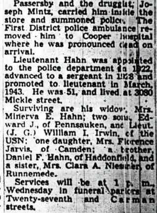 EDWARD C. HAHN was born around 1893. He was appointed to the Camden Police Department in 1922, was promoted to Sergeant in 1923, and to Lieutenant in March of 1943. Lieutenant Hahn was on duty at the Third Police District headquarters at 27th And Federal Streets, a short walk from his home at 3080 Mickle Street, when he was struck down by a fatal heart attack on April 2, 1944. He was survived by his wife Minerva, sons Edward J. and William, and a daughter, Florence. |