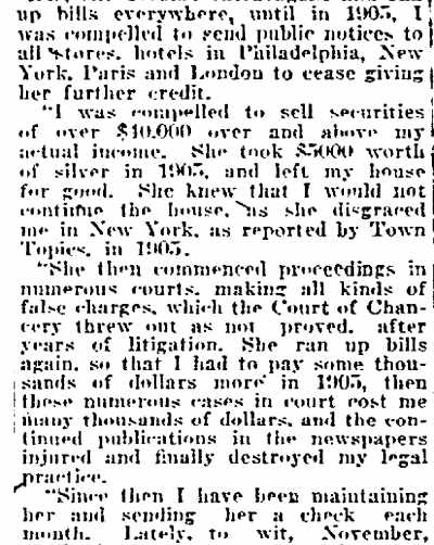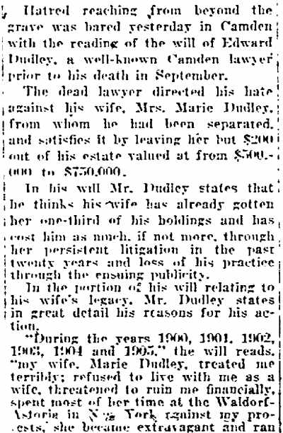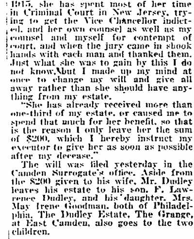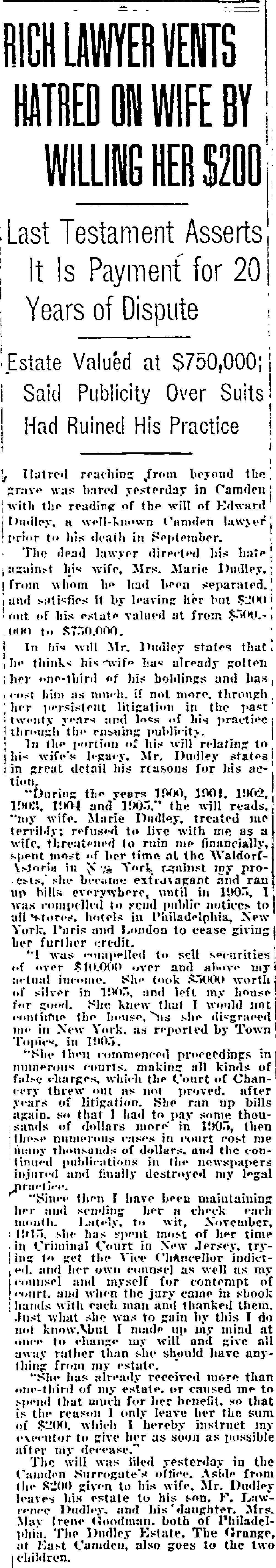 In 1898 Edward Dudley married Mary Mulock in Naples, Italy. A socialite from Philadelphia, she was 25 years his junior and appears to have married entirely for money. By 1905 Edward Dudley had enough, and divorce proceedings were instituted. Mrs. Dudley counter-sued and the Dudleys were in and out of the courts and the newspapers even after Edward Dudley's passing. The notoriety and the time spent defending himself from frivolous legal action too up much of his time and in is own wordsm destroyed his legal practice. Edward Dudley died at The Grange on September 13, 1920. |