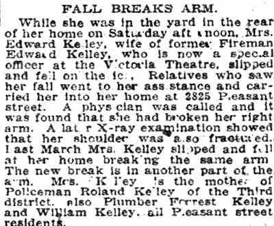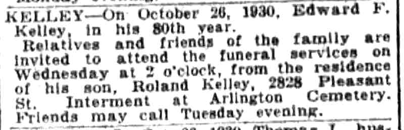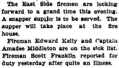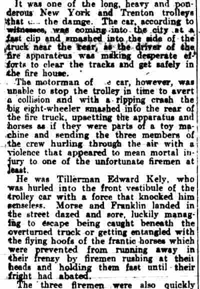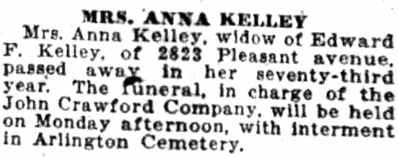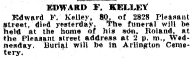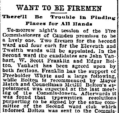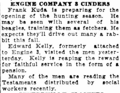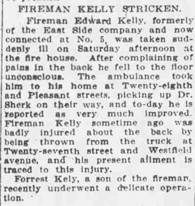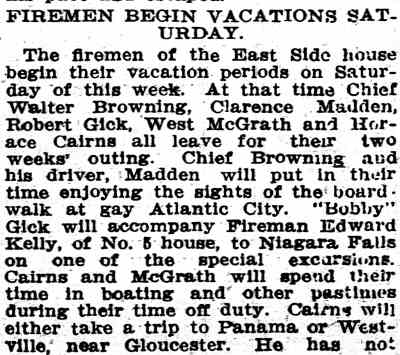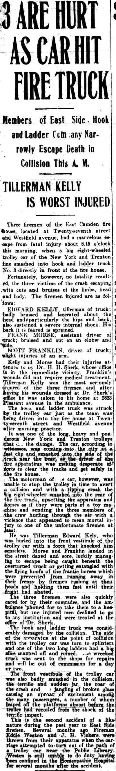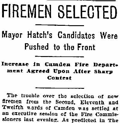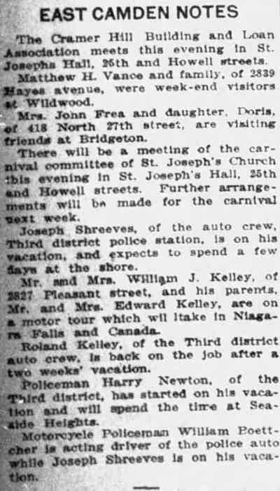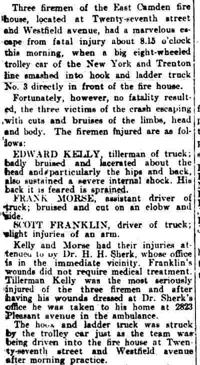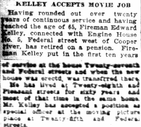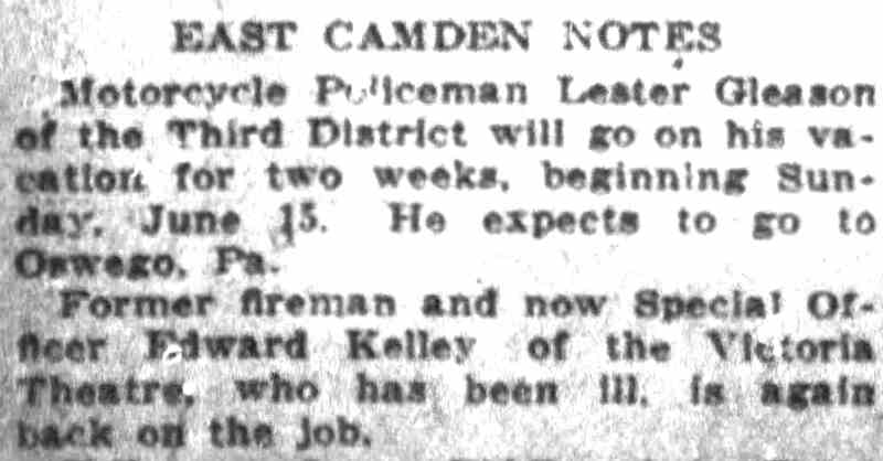 EDWARD F. KELLEY whose name also appears in print as Edward Kelly, served with the Camden Fire Department. A longtime resident of the 2800 block of Pleasant Street, he was appointed to the Camden Fire Department in 1899 and remained a member until June of 1920, when he took a position as a "special officer" at the then-new Victoria Theater, which stood at 2514-2520 Federal Street. He initially served with Ladder Company 3. In 1909 he was been transferred to Engine Company 5, where he finished his career. Edward Kelley and his wife Annie were living at 2823 Pleasant Street as early as 1887. Prior to his career as a fireman he worked as a bricklayer. Around 1899 he built a twin home at 2727 and 2829 Pleasant Street. These homes were occupied by Edward Kelley's sons William and Forrest and their families as late as 1948. Son Roland lived as early as 1910 until his death in 1931 at 2828 Pleasant Street, his wife Clara and their son Quentin were also living there as late as 1949. Edward Kelley passed away on October 26, 1930 and was buried at Arlington Cemetery in Pennsauken, New Jersey. His wife Anna had died on February 26, 1926 |