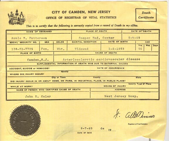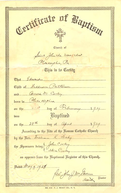 A bank book for an account opened in 1946 shows the name Anna Mary Patterson. The only logical explanation that I can deduce from the presence of the papers and pictures in Edward Patterson's effect is that David was his younger brother, quite possibly a half-brother, as William Patterson's name does not show on the document below with the baby's thumb- and footprint. |