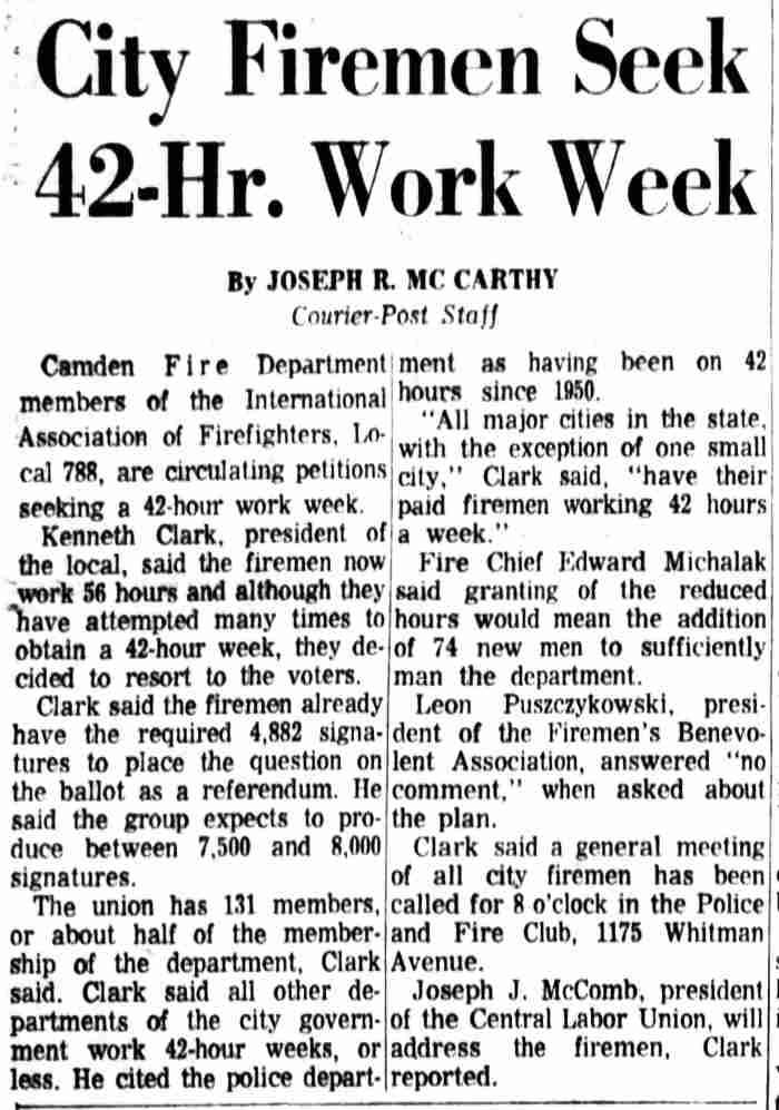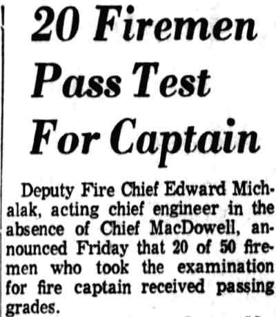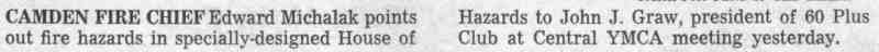 Eight Cited For Service Above Duty Two Camden Fire Department Engine Companies were awarded unit citations and eight firemen attached to the companies were each given merit citations yesterday for service above and beyond the call of duty. Camden Fire Chief Edward V. Michalak awarded the citations to representatives of Engine Companies 3 and 10 in ceremonies held in the department's headquarters at Third and Arch Streets. Chief Michalak said the eight firemen under adverse conditions and without regard to personal safety, boldly rescued two children from a burning second story bedroom last August 20. According to michalak, captain Chester Gedrich, 47, entered the home located at 2108 Van Buren Street, by ladder and rescued 8 month old Tracy Bagby, passing her to Joseph J. Lesniewski, 40, who took her to the street and gave her artificial respiration. Meanwhile, Michalak said, acting Captain James Robinson, 31, entered the flaming building, went up the stairway and rescued, Tracy's, 7-year-old brother Kenneth. Assisting in the rescue were firemen Clair H. Graham, 58, Harold Johnson Jr., Ronald Gorski, 30, George Kurtyan, 24, and Robert W. Frett also 24. |