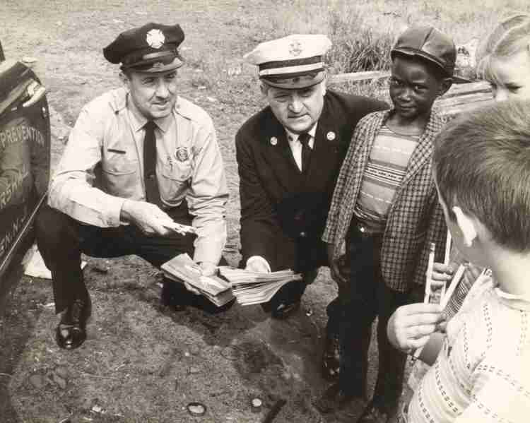 In the staff office at Fire Headquarters (kneeling from left) Fireman Ernest Tartaglia, Fireman Howard Lewis, Fireman Harrison MacNeir; (standing from left) Captain Allen F. Hess Sr., Fireman Dominic Dalanni, Fireman Henry Keubler, Chief Harry Wagner, Fireman James Troutman, Chief Edward Michalak, Fireman James Smith, Chief Edward MacDowell, Fireman John Yates, and Fireman George Wade. - 1961 |