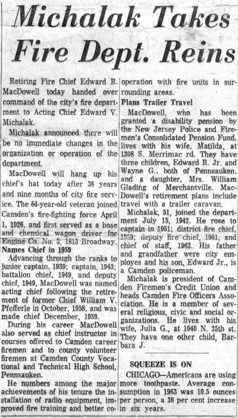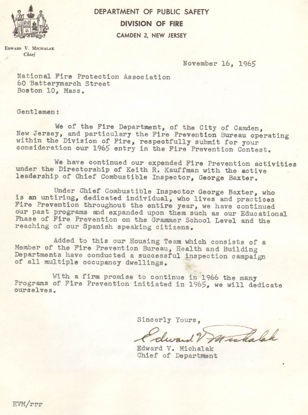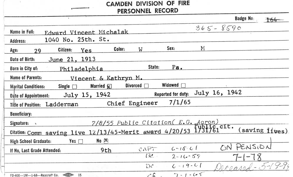 EDWARD VINCENT MICHALAK was born in Philadelphia, Pennsylvania on June 21, 1913 to Kathryn M. and Vincent Michalak. He was appointed to the Camden Fire Department on July 15, 1942 and reported for duty the next day with one of the ladder companies. Edward Michalak rose through the ranks of the Fire Department. He was promoted to Captain on June 15, 1951, to District Chief on February 16, 1959, to Deputy Chief on June 19, 1961, and finally to Chief of the Fire Department on July 1, 1965. Chief Michalak served as Chief of the Department for 13 years, retiring on pension on July 1, 1978. During his tenure he, the Fire Department, and the City of Camden faced many challenges, including the riots of 1967 and 1971, the Poet's Row catastrophe, and the problems associated with the declining tax base and revenue available to the city for the provision of services. During his career with the Camden Fire Department Chief Michalak received a commendation for saving lives on December 13, 1945, a merit award on April 20, 1953, a public citation from then Commissioner of Public Safety E. George Aaron on July 8, 1955, and another public citation on January 31, 1961 for again saving lives. Chief Michalak made his home at 1040 North 25th Street in Cramer Hill. The Chief passed away on May 19, 1994 and was buried with full departmental honors. |