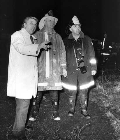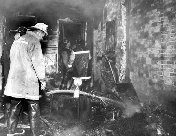 November 23, 1977 - A Second alarm fire in an unlicensed boarding house took the lives of five senior citizens on at 2939 Mitchell Street in East Camden. In this photo Chief Edward Michalak is seen exiting the house in the aftermanth of the fire. |