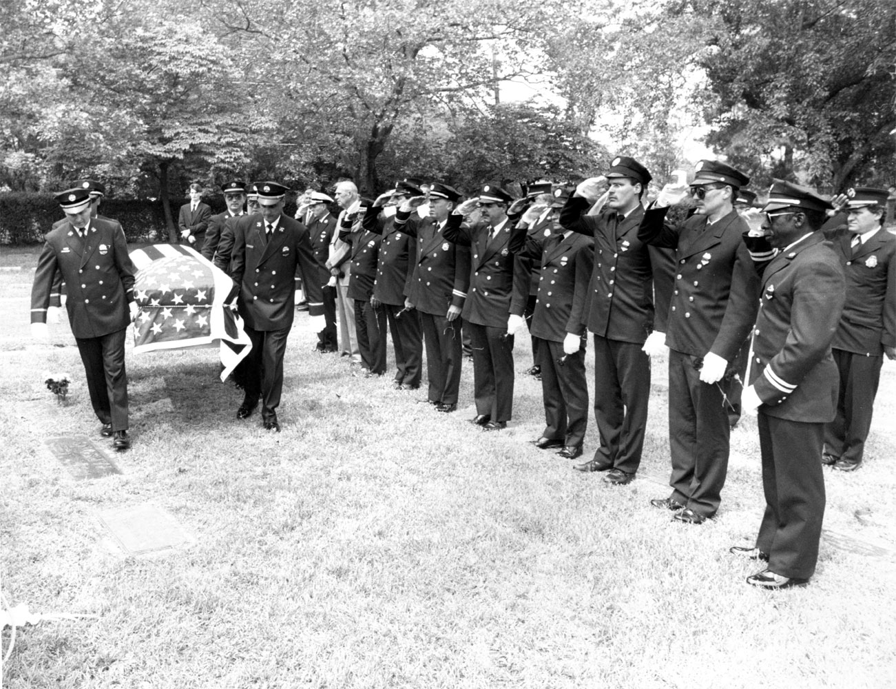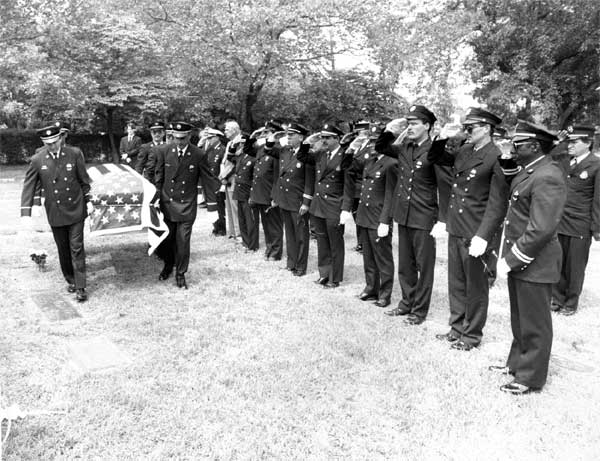Members of the department render salute as Pallbearer Detail of six Chief Officers carry the remains of Chief Edward Michalak to his final resting place at Arlington Cemetery in Pennsauken, New Jersey. In fromation at far end of the column is Chief of Department Kenneth Penn and former Chief of Department John J. Mogck Jr. |