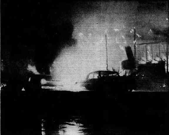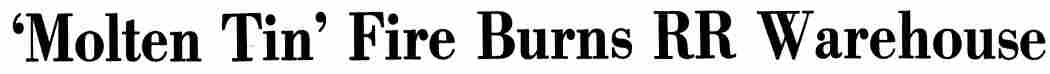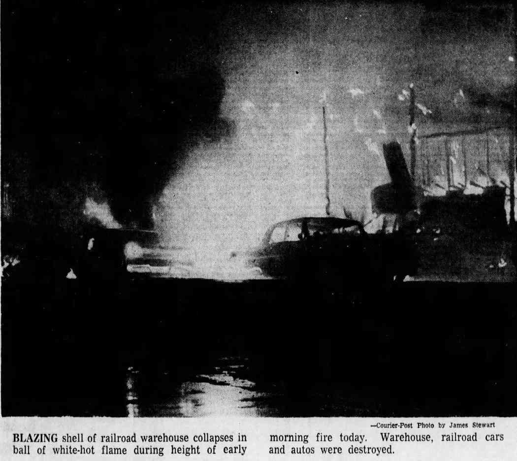 BLAZING shell of railroad warehouse collapses of ball of white-hot flame during height of early morning fire today. Warehouse, railroad cars and autos were destroyed. |