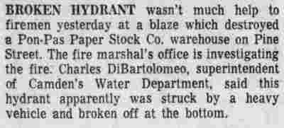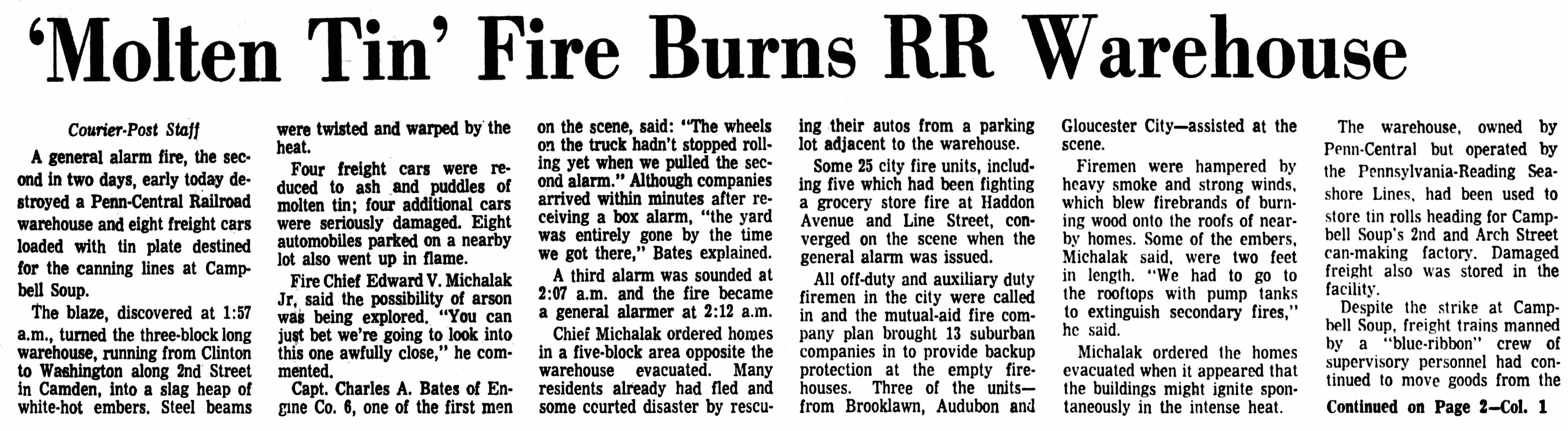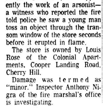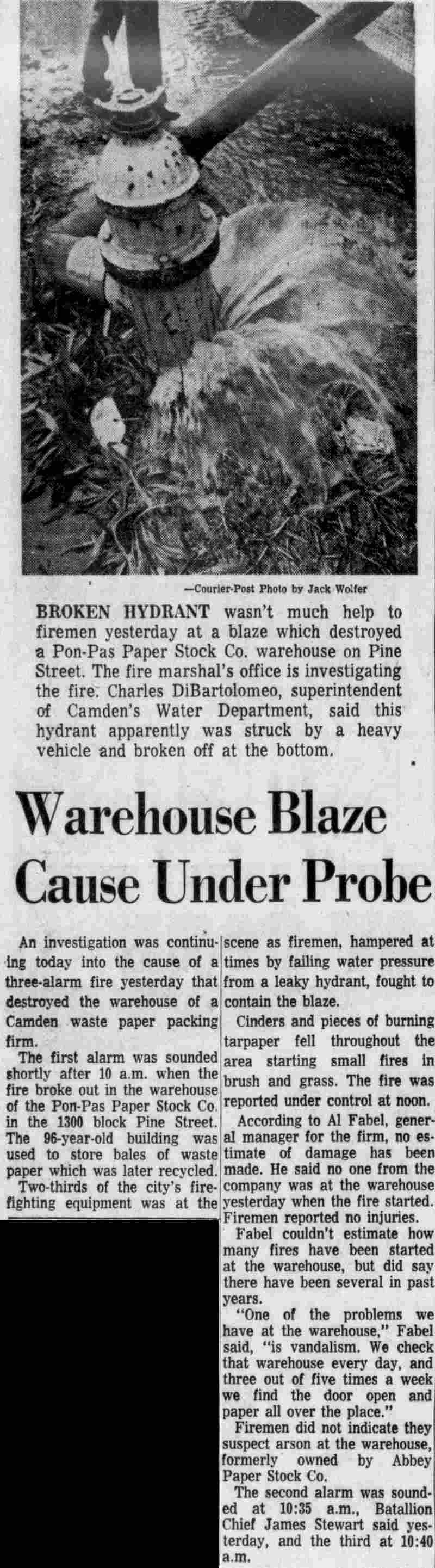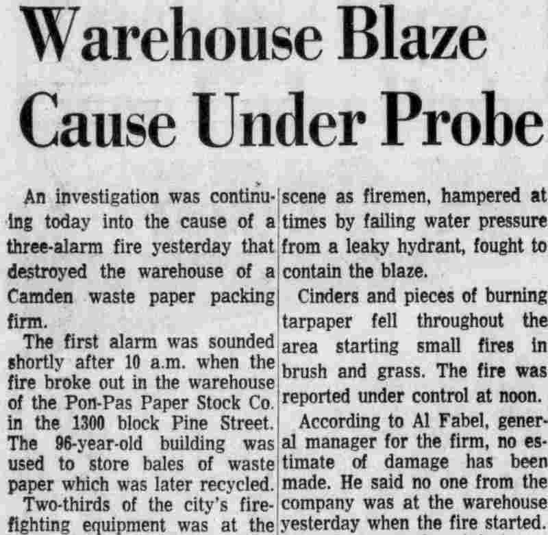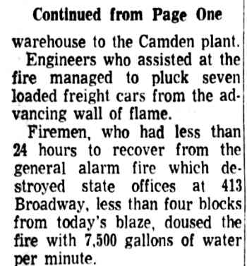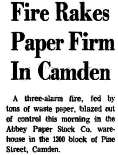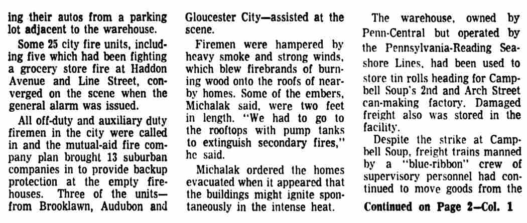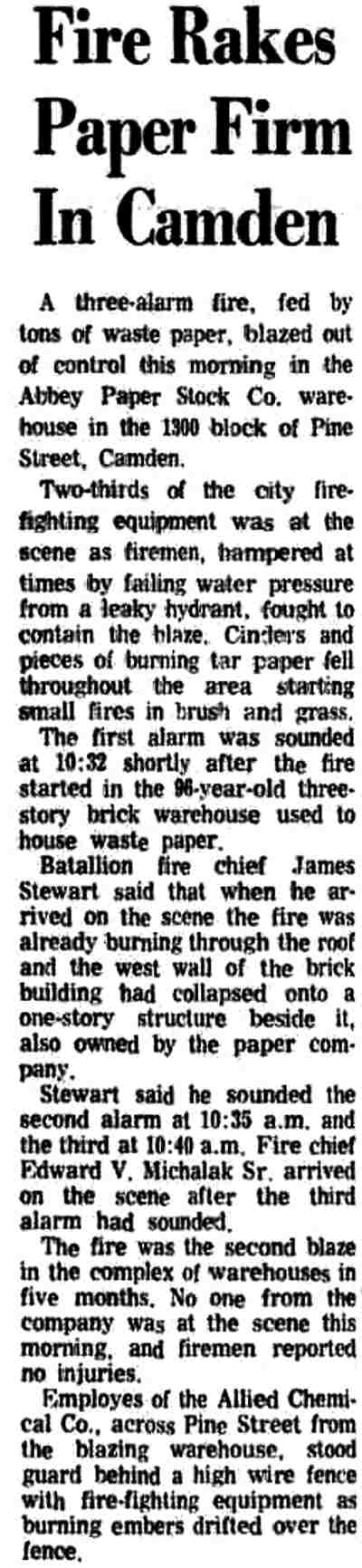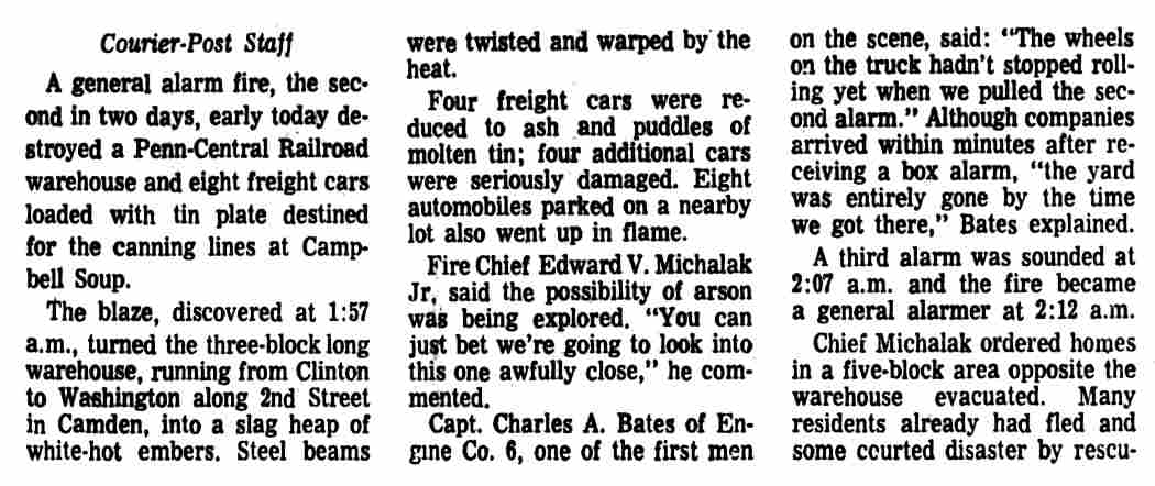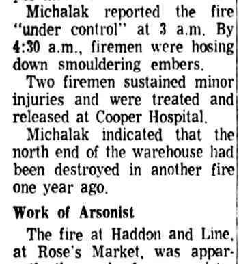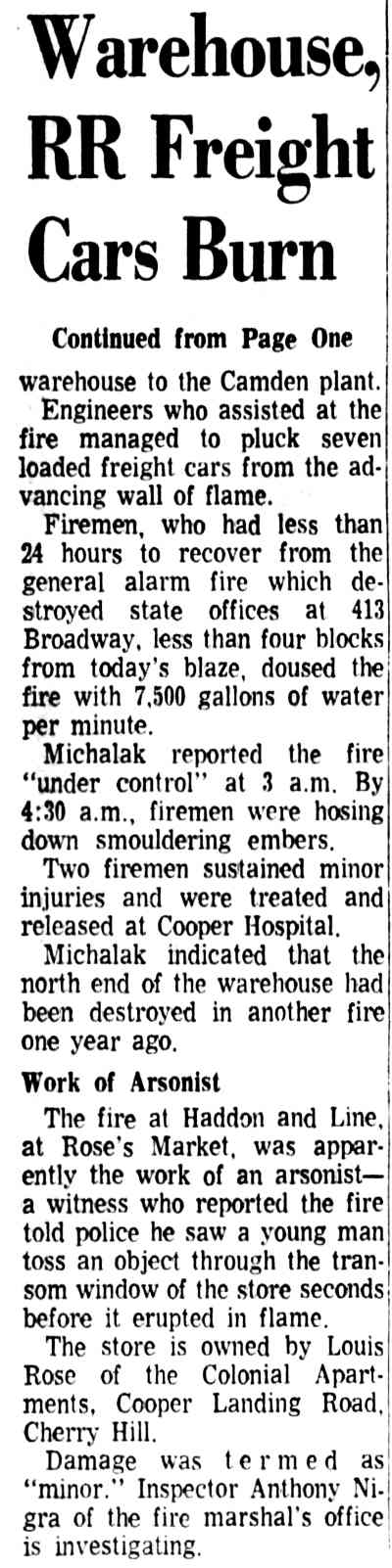 Trapped in Blaze Saved by Firemen City firemen fought smoke, flames; snow and a biting cold during the night and early morning hours as a rash of fires 6everely damaged four buildings and destroyed a tavern. According to Public Safety Director Keith Kauffman, at one point only two engine companies were not actively fighting the blazes as seven engine companies, three ladder companies, the rescue squad and three battalion chiefs were at the fire scenes. At the site of the worst fire, 5th and Mickle Streets, police and firemen braved dense smoke and fierce flames to rescue four elderly persons trapped in first, second and third floor apartments. Started In Tavern Lounge The blaze, which broke out in the lounge of Ray's Tavern, was discovered by Patrolmen Augustus Balzano and Anthony Saponare at 3:58 a.m. after they were alerted of smoke by highway employees battling the second snowstorm of the week. The two policemen, after radioing the alarm, kicked in the door of the tavern and raced through the smoke and flames to rescue Mrs. Agnes Lockhart, 58, from her upstairs apartment. The patrolmen took Mrs. Lockhart to Cooper Hospital where she was admitted with a cut head and smoke inhalation. Minutes later firemen, headed by Battalion Chief Biaggio Ardire, arrived. Ardire said the tavern was engulfed in smoke and flames. He said the flames leaped from the tavern roof to a luncheonette and apartment building next door. Ardire said firemen raised a ladder to the third floor of the second building where Mrs. Mabel Seward, 64, was hanging from a window ledge. However, fireman were hampered in the rescue attempt by the narrow space of the alley and could only hold the screaming woman until other firefighters could make their way to the third floor window from inside the building. The rescuers, wearing face masks, wrapped Mrs. Seward in blankets and carried here through the flames to safety. Two Carried Out At the same time, more fire fighters entered the burning building and carried out Mrs. Viola Lagerprantz, 65, who lived in a rear apartment on the first floor and John J. Smith, 86, from a second-floor apartment. All the victims were taken to Cooper Hospital for smoke inhalation treatment and released an hour later. Kauffman ordered the victims, still wrapped in blankets, taken to fire headquarters at 3rd and Arch Streets and notified city welfare authorities. The Welfare Department obtained temporary housing for the three victims at Volunteers of America headquarters, 828 Market Street. Each victim lost all possessions in the blaze. Additional Alarms Ardire, at, 4:27 a.m. called for additional fire crews and an hour later requested more aid. Battalion Chief Daniel Jiannetto's unit answered the first distress call while Acting Battalion Chief Arthur Batten's men arrived on the second plea. Batten's unit had been fighting two North Camden blazes since 10:53 last night. Ardire said that when firemen attempted to get into the buildings, the fire was raging forward, backward, and straight up the stairwells out of control. The owner of the luncheonette, Dominic Padulla; arrived at the scene about 5:30 a.m. Padulla and his brother, Frank, who also had been out, live on the first floor. Canteen Truck on Scene Volunteers of America Canteen truck with Colonel William Gwynne also was at the scene and served firemen coffee and donuts. Fire Chief Edward Michalak said he has ordered a complete investigation of the fire. Kauffman said 5th Street south of Mickle and Mickle Street east of 5th has been closed to traffic indefinitely. In the two other fires in North Camden, a grocery store was damaged at 442 N. 9th Street, and two vacant buildings at 623-625 North Front Street were damaged. Grocery Store Blaze Batten said a defective chimney apparently caused the grocery store blaze which raged through joists and partitions. The store is operated by Benjamin Lamberte while the building is owned by Mrs. Sarah Schecter of Baird Boulevard according to the battalion chief. Batten's crew were forced to make two trips to the vacant buildings as wind whipped flames. He said the fire probably was caused by vagrants seeking shelter from the snowstorm. Before the firefighters could take off their fire apparel, they were dispatched to the 5th and Mickle Street blaze. |