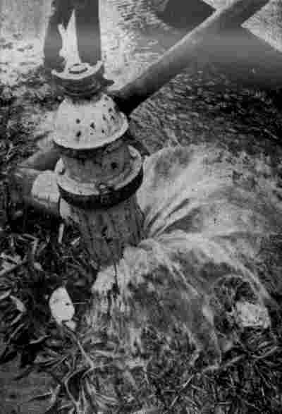 Photo by Bob Bartosz KNEELING to hold hose in place, firemen backed off, a moment later as rear of vacant building at 1729 Railroad Avenue caved in during three alarm blaze yesterday. Two persons were hurt. Probe of faulty fire hydrants has been asked. From Left: Captain Joseph Wolfinger, Albert Jones, William O'Dennis