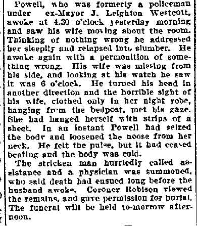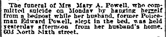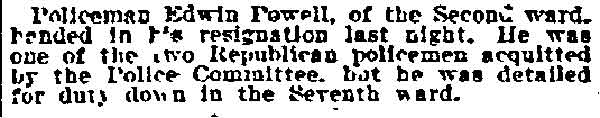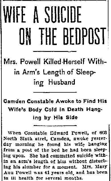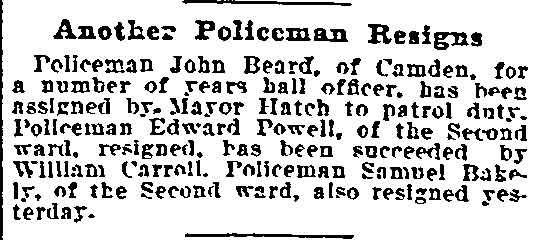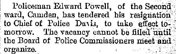 The 1879-1880 City Directory shows Edwin Powell working as a teamster and living at 222 Erie Street. His brother Belin lived next door at 220 Erie Street. The 1880 Census shows Edward Powell, his wife Emma, and children Clarence 3, and George, 1, at 222 Erie Street. Edward Powell and his brother Belin had gone into business selling kindling wood. Belin went back to farming after awhile, Edward, however, was still in the kindling wood business in 1883. Edward Powell is not listed in the 1884-1885 or 1885 Camden City Directories. He is listed in the 1887-1888 edition, living at 801 Linden Street. He had by this time been appointed to the Camden Fire Department. He was still with the Fire Department in 1888, but had moved to 335 North 9th Street. Edward Powell had left the Fire Department by January 19, 1889. He worked as an engineer with Camden's Water Department in 1889. On January 1, 1890 he was appointed to the Camden Police Department, taking the place of George H. Wheaton, who had resigned.. The 1890-1891 Camden City Directory shows that Edward Powell had moved to 603 North 6th Street. He had been appointed to the police department. Edward Powell served as a Camden police officer until May of 1898, when, along with many other officers, he was let go by Mayor Cooper B. Hatch. The 1899 Camden City Directory shows that he had gone into business with Samuel S. Bakley, selling springs. The business was known, appropriately enough, as Powell & Bakley, and operated out of 603 North 6th Street. Both men had served together in North Camden as police officers throughout the 1890s. The 1899 City Directory also indicates that Edward Powell's wife was named Mary, it is not not known at this point whether this is the same person he was married to in 1880 or not. The 1900 Census shows Edward Powell, wife Mary, and daughter Sallie living at 603 North 6th Street. Boarding with the Powell family was Camden firefighter Amedee S. Middleton. Tragedy struck the Powell family in 1900, when Mary Powell, whom had been ill for some time, committed suicide. By 1906 Edward Powell had moved to 506 North 5th Street, and had gone into the fish business. Sadly, by 1910 Edward Powell was a widower. When the census was taken that year, he was living at 431 Vine Street with a widow, Sarah Rowley, and her daughter and son-in-law, Gertrude and Albert Eadon. The 1914 City Directory shows Edward Powell had moved to 527 Spruce Street in South Camden. He was was operating an oyster house at 506 North 5th Street. Edward Powell was still in the oyster business at this address as late as 1927. Edward Powell did not stay in South Camden for very long. By 1918 he had moved to 614 North 5th Street. The 1920 Census shows him living at 510 North 4th Street, and that he had remarried. It appears that his wife was the former Sarah Rowley, with whom he was living with at the time of the 1910 Census. The Powells were still residing at this address as late as April of 1930. Edward Powell later moved to 312 York Street. He passed away on August 6, 1934 and was buried at Evergreeen Cemetery. |