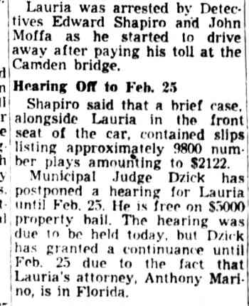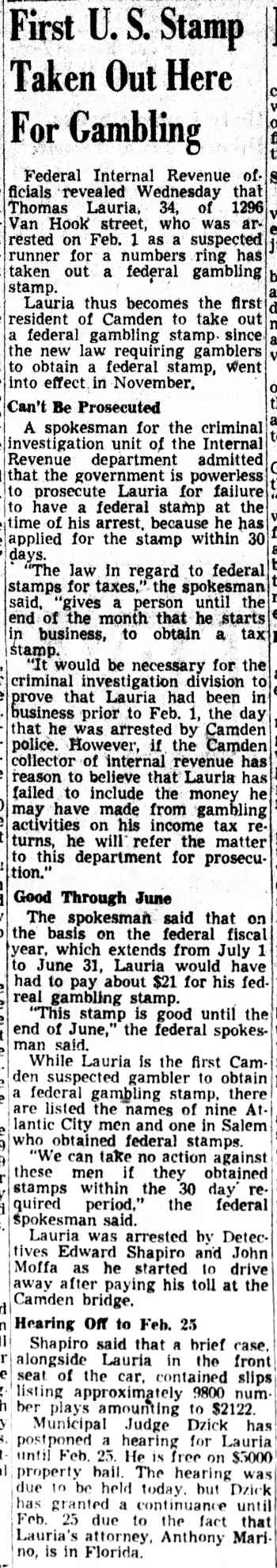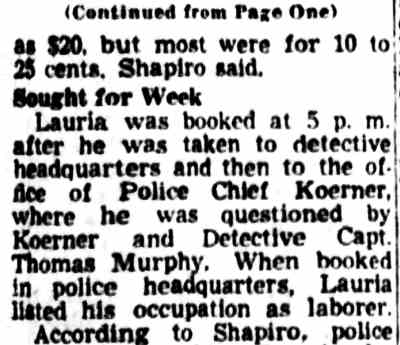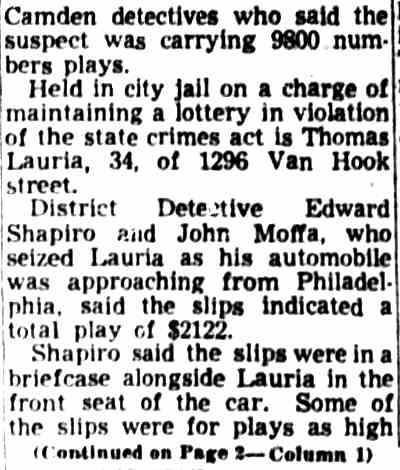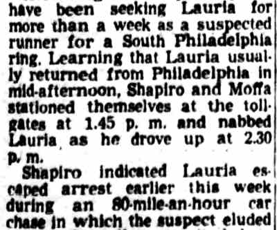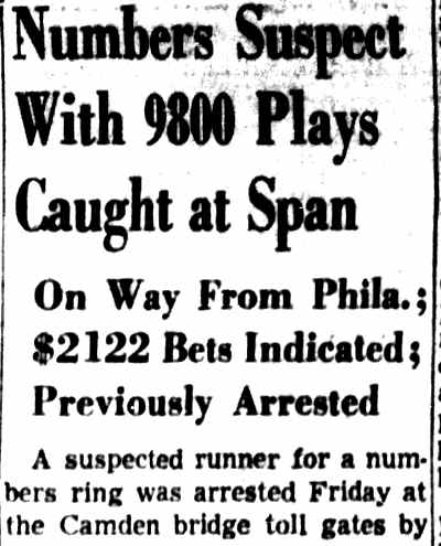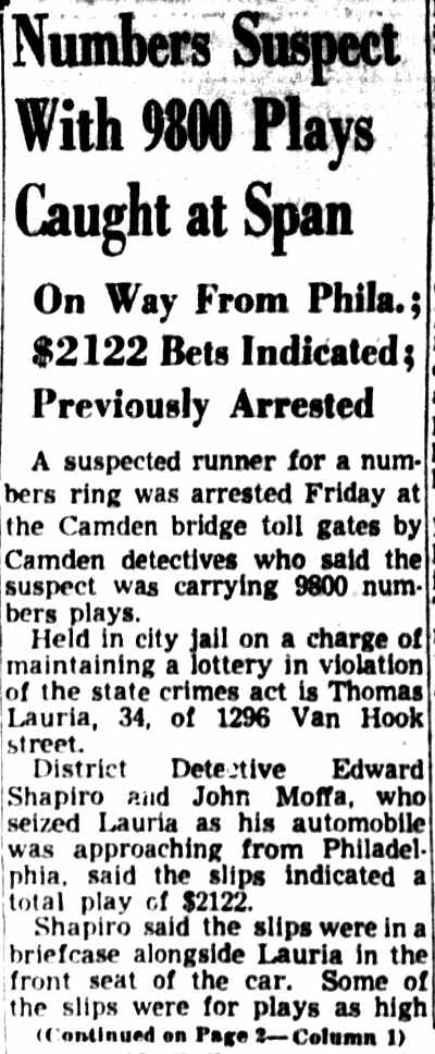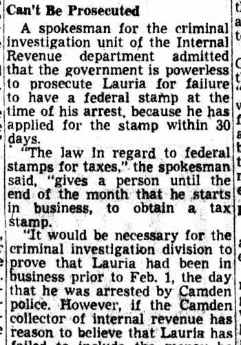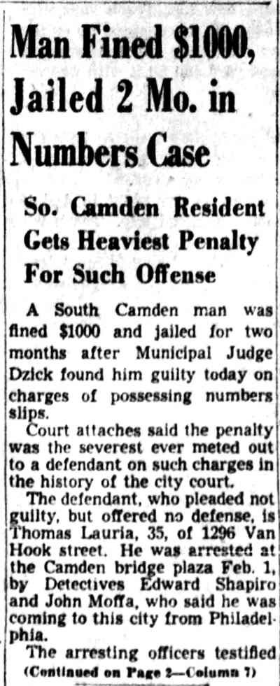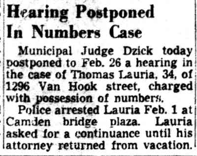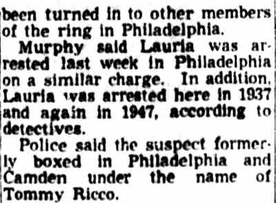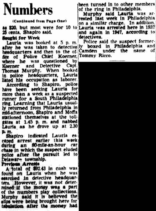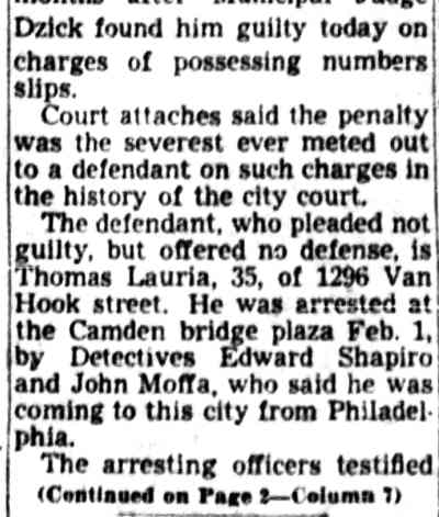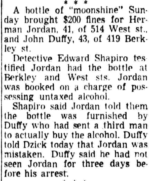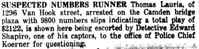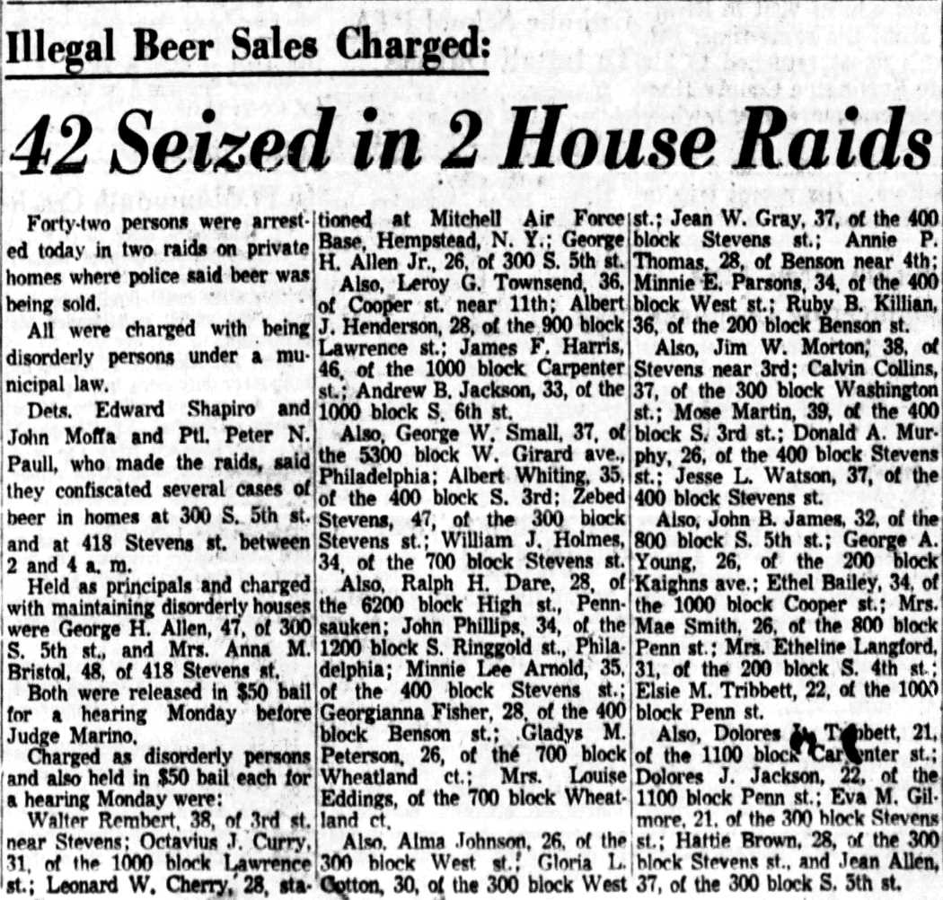 Four men were arrested amid revolver shots after a Camden policeman was knocked down by a police car during a raid yesterday afternoon. Acting on orders of Commissioner Mary W. Kobus, who is continuing her drive to rid the city of speakeasies, three policemen and two detectives surrounded the home of James Ford, colored, at 1124 South Ninth street, shortly. before 3 p. m. Patrolmen Edward Shapiro and Thomas Kauffman arrived in a radio car. So did James Brown and John Houston, two colored detectives. Patrolman Earl Stopfer arrived on foot. Three policemen went to the back door. Kauffman stayed in the radio car at the front. Shapiro knocked at the front door. The policemen at the rear were ahead of those opt front. As a result four men ran out through the front door and bowled over Shapiro. The man in the lead, who later was identified as Wilbur "Lackey" Davis, of 821 Mt. Vernon street, raced up the street, a quart bottle of liquor in hand. Kauffman had driven his radio car behind another machine. He started the engine and attempted to back out to give chase. Shapiro ran behind the car and as he did, the machine struck him, knocking him into the middle of the street. Prone, Shapiro drew his revolver and opened fire on Davis. Three shots were fired in the air. Two others were closer to the fugitive, who halted. With the sound of shooting, the other three men yielded to the assembled policemen. They gave their names as Ford, Herman Hopkins, 21, of 1124 South Ninth street, and Harry McLane, 29, of 746 Kaighn avenue. All will be arraigned today. Ford, Hopkins and McLane will be charged with violating the state A.B.C. act. In addition, Davis will be charged with resisting arrest. Patrolman shapiro was hurt but slightly. |