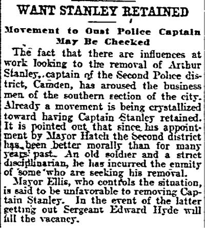EDWARD S. HYDE was born around 1868. He was appointed to the Camden Fire Department on March 28, 1893 and served as an extra man for one year, until accepting an appointment to the Camden Police Department, which came on April 14, 1894. He was promoted to sergeant five years later, and on January 1, 1908 was elevated to Captain, serving at police headquarters under Chief Elisha A. Gravenor. He was promoted to assistant chief in 1915 and upon Chief Gravenor's retirement was named acting chief of police, effective August 1, 1922. When the political winds shifted after the May 1923 election, Chief Hyde found himself serving under a new Public Safety Director, Commissioner Frank Hitchner. On July 15, 1923 he was let go on pension, replaced as Chief of Police by James E. Tatem. Edward Hyde was politically active as a member of the Seventh Ward Republican Club and remained so after leaving the Police Department. He was elected to the Camden County Board of Freeholders from the Seventh Ward in 1928. He took ill the following year, and on April 23, 1930 passed away. Edward Hyde married Minna Buzine. Her father, Samuel Buzine, was a charter member of the Camden Fire Department and served for many years as assistant chief under Samuel S. Elfreth. Minna Buzine's brother william buzine and her uncle Lewis Buzine also served with the fire department, as did her brother-in-law, joseph f. ernst. another brother-in-law, James Roach, married to Minna Buzine Hyde's sister Clara, served with both the Fire and Police Departments, and as bridge tender at the State Street Bridge. |