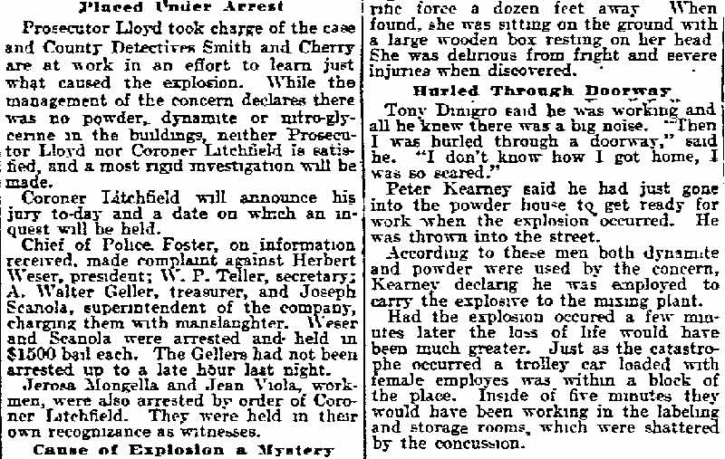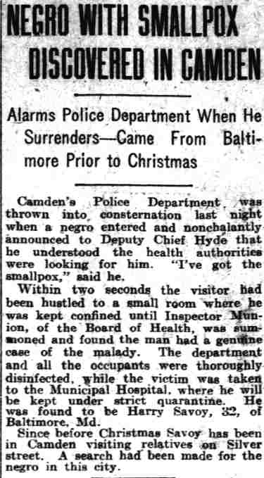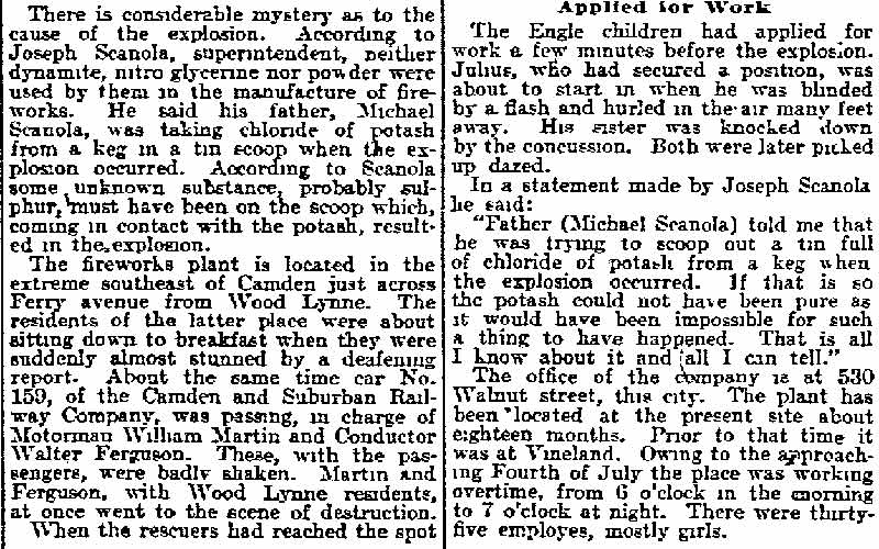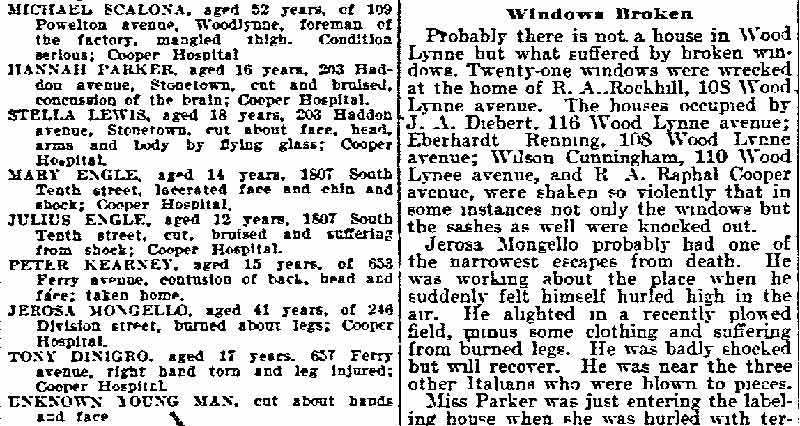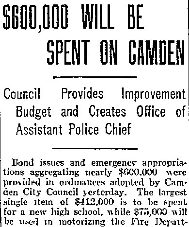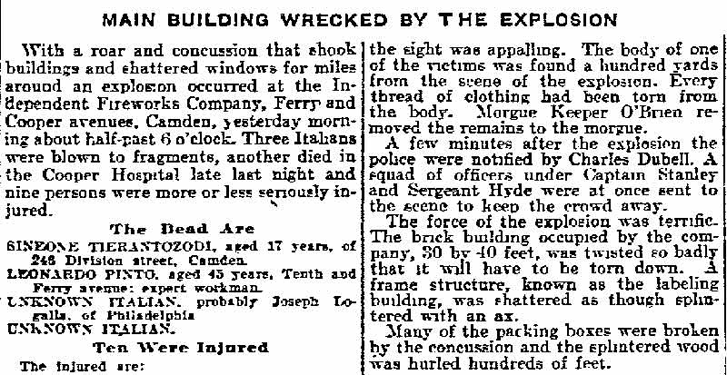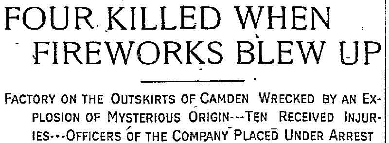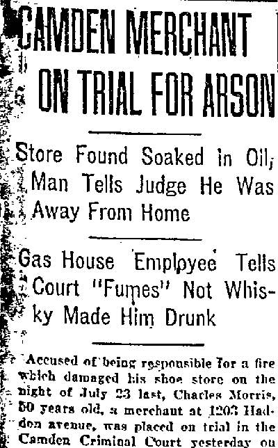 TO PROBE $200,000 KAIGHN AVE. FIRE FIRE CAPTAIN MAY DIE, FOUR OTHERS INJURED; DAMAGE IS $200,000 Economy Store and Other Buildings Near Broadway Swept by Flames Early This Morning- Falling Debris Carries Men Through Roof And Into Cellar- Sleeping Inmates of Apartments Roused and Invalid Carried to Safety- Mayor Sees Rescues Mayor Ellis has ordered an investigation to determine the cause of the $2000,000 fire which swept the properties at 427 and 429 Kaighn Avenue and caused injury to five firemen, one of whom may be fatally hurt. The fire centered about the property occupied by the Economy Store, formerly Handle’s, and quickly spread to four adjoining buildings. The fireman whose recovery is despaired of is Captain Martin B. Carrigan, of Engine Company No. 2, Fifth and Arch Streets. Carrigan, who lives at 618 West Street, is suffering from a fractured skull and severe burns and cuts of the face, legs, and body. He is unconscious at Cooper Hospital. The firemen were injured when a wall, weakened by the intense heat, crumbled and crashed through a roof upon which they were standing, dragging them through the floor below, and into a cellar. Sensational rescues followed as police, firemen, and citizens with bare hands tore at the hot debris. The men were quickly extricated and carried to the street. “We certainly shall investigate this fire,” the Mayor declared today. “Just what was the cause and who is to blame has not been determined but there will be a thorough investigation.” “There have been too many of these fires during the past few weeks” continued the mayor. “Surely all of them did not just happen and I am sure there has been someone responsible in one or two of the fires.” The conflagration was one of the most spectacular of a series of large fires that have visited the city in the past six weeks. The block in which it occurred- Kaighn Avenue between Broadway and Fourth Street is one of the most prominent business squares in Camden. Flames shot 200 feet in the air, giving the sky a fiery hue and attracted attention for miles before the firemen brought it under control. The flame-lit sky was clearly seen in Philadelphia, Merchantville, East Camden, Gloucester and other communities. More than a score of families living in the vicinity were forced to flee from their homes in scant attire when the fire threatened them. They were cared for by neighbors. Fireman George Boone, 46 years old, of Engine Company No. 2, also is in a serious condition. He is suffering from burns of the right hand, right thigh and foot and probable internal injuries. Boone lives at 607 Mount Vernon Street. The other injured foremen are: John Voll, 22 years old, 509 Royden Street: both hands badly burned. C.J. Andrus, aged 31 years, 570 Mount Vernon Street: burns of hands and legs. Harold Lorang, 29 years old, 19 Hudson Street: burns of right hand and legs and sprained ankle. Firemen Prove Heroes Carrigan and Boone are in the hospital. The other firemen were discharged after their wounds were dressed. After being released from the hospital they returned to the scene of the fire and insisted upon continuing their duties. Chief Peter B. Carter, however, ordered them home. Most of the loss was suffered by the Economy Store. A few charred walls remain of the large building. The interior was completely gutted. It was estimated today that the damage to that property will total $60,000 At least $50,000 damage, it was said, was done to the stock. Morris Handle, local theatrical man, who owns the building, declared today that the property was insured for $30,000. “My loss will be quite heavy,” said Mr. Handle. “The insurance will not pay one-half the property damage.” The adjoining building at 431 Kaighn Avenue is occupied by Dr. S.I. Yubas, optometrist, and L.R. Yubas, his father, a jeweler. Invalid is Rescued The rear and upper floors of the Yubas property were gutted and the stock sustained a heavy loss, due to water and smoke. The damage will total $40,000, Mr. Yubas estimated today. Five persons who were asleep on the upper floors of the Yubas dwelling had narrow escapes. They were awakened by Samuel Goldstein, haberdasher, 417 Kaighn Avenue, who discovered the fire in the Economy Store and turned in the alarm. Mrs. L.R. Yubas, an invalid, was rescued with difficulty. The property occupied by Mrs. Sadie Bodner, a widow, at 433 Kaighn Avenue, as a house furnishings store, was scorched and also damaged by water and smoke. Adjoining the Economy Store on the west at 425 Kaighn Avenue is a vacant one-story structure, formerly occupy by the United Beef Company. Firemen were on the roof of that building when the west wall of the Economy Store collapsed. The wall tumbled down on the small roof and hurled the firemen through a hole in the roof, through the floor and then into the cellar. Several Stores Damaged Three policemen, joseph sparks, Thomas Cheeseman, and George Hill- and several spectators braved the fire and smoke to rescue the trapped firemen. The property at 423 Kaighn Avenue, occupied by the Charles Jamison Department Store, was damaged in the rear and the stock ruined by water and smoke. The Kresge Five-and-Ten-Cent Store, at 519-531 Kaighn Avenue, was also damaged by water. Louis Richelson, who owns the properties from 519 to 525 Kaighn Avenue, was unable to estimate his loss today. Collapse of Wall Hundreds of spectators, who were watching the fire from the opposite side of the street, shuddered as they saw a brick wall, weakened by the intense heat, totter and sway. Before the firemen on the smaller roof below could scurry to safety, it collapsed. A groan escaped the crowd as they heard the cries of the entrapped firemen and the deafening thud of the brocks as they landed on the roof where the firemen were at work. As the full weight of the brocks struck the roof, it caved in forming a gaping hole. The firemen were literally swept into the opening. The bricks tumbled down, causing an
