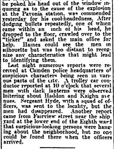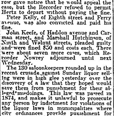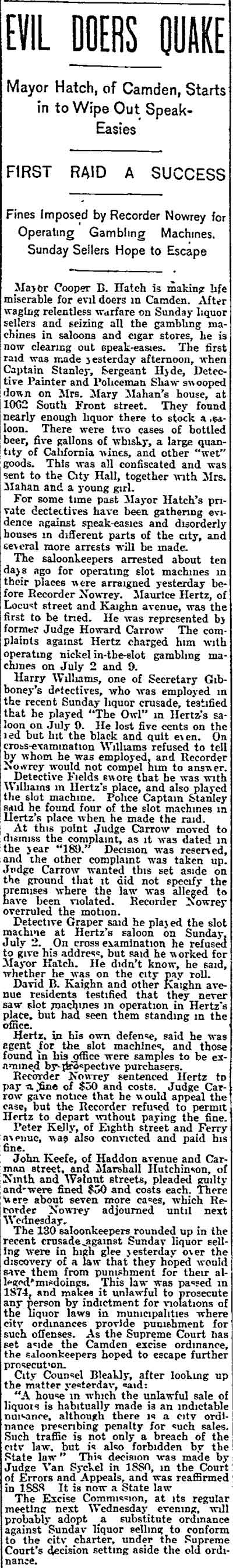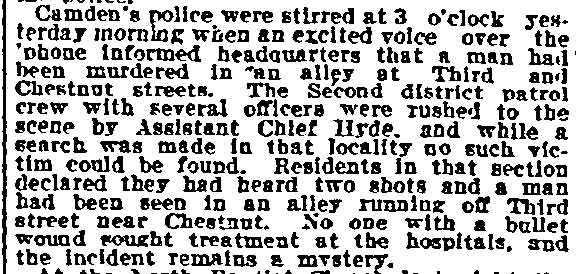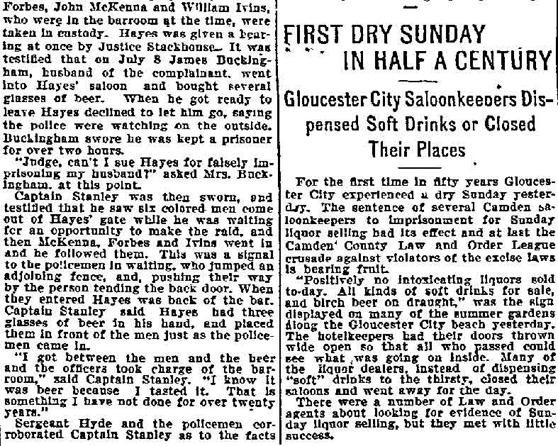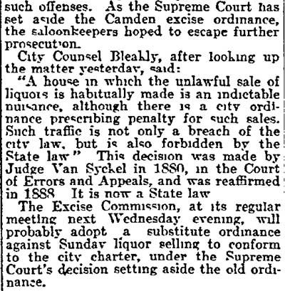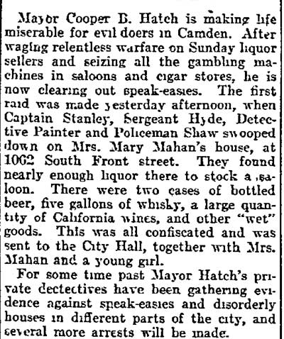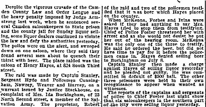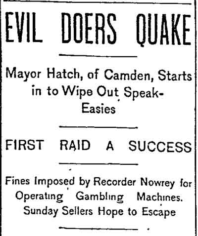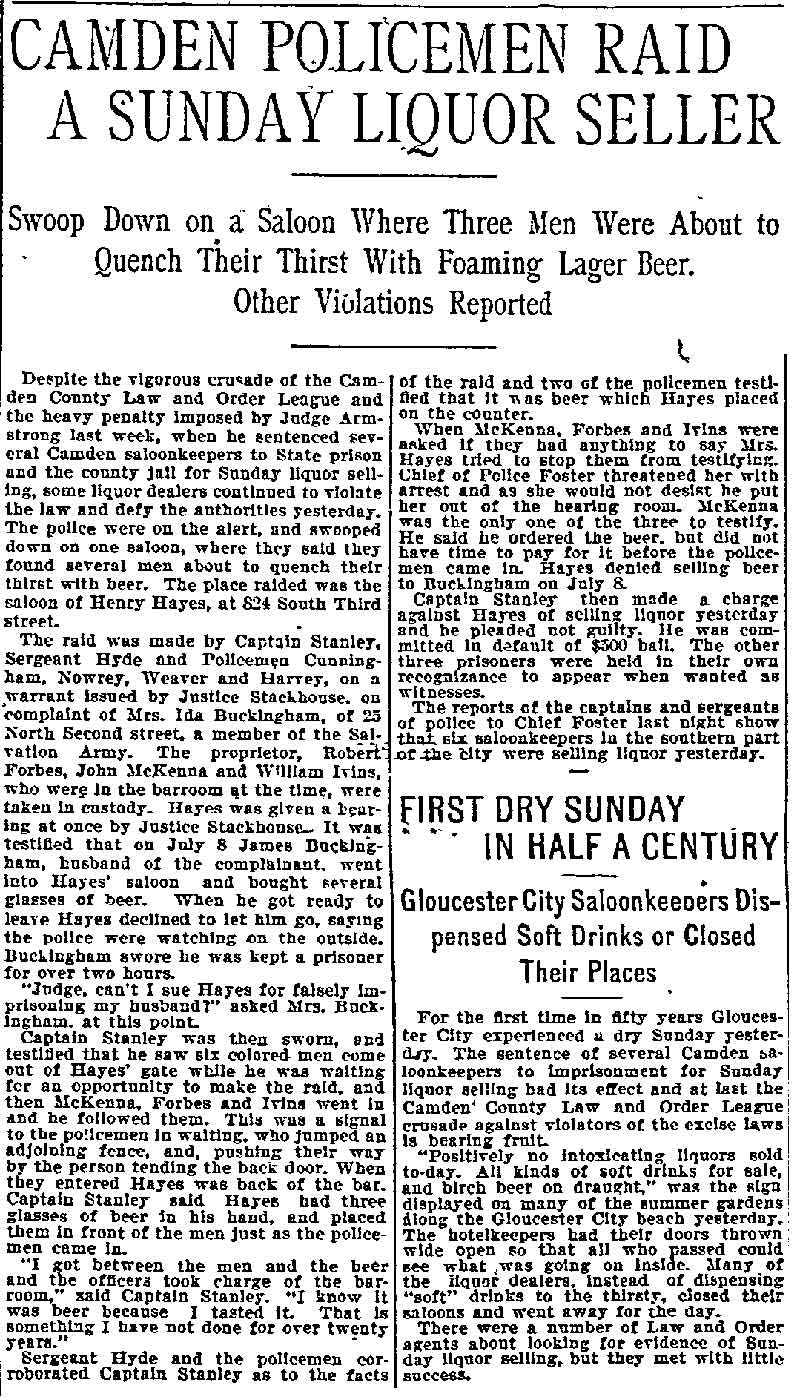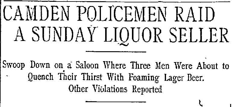 DENIED Camden Police Chief Says Patrolmen Listing Visitors Are Without Orders END ESPIONAGE HAST NIGHT Assistant Chief Edward S. Hyde who is temporarily head of the Camden police department, denied today that patrolmen are acting under any orders of police officials or have received any instructions in the matter of standing in front of saloons and taking the names and addresses of persons who enter. Patrolmen acting on orders of the Federal prohibition enforcement authorities yesterday stood at the entrances of drinking places and inquired the name and address of every patron who entered. The patrons thus made themselves liable to be summoned as witnesses against themselves or against the saloonkeepers before the Federal Grand Jury in case the liquor sold is found to contain more alcohol than the Volstead law allows. Assistant Chief Hyde said he is very much in the dark as to the strange procedure. He said the patrolman engaged in making the canvas arc acting as individual citizens and not as patrolmen. In most instances the names were given freely. Only in one instance was any untoward incident reported. That happened in the shipyard district when about 200 workmen, quitting for lunch at noon, flocked to the South Camden bar. Jeers and hoots greeted a patrolman who attempted to poll them as they entered, and he gave up the attempt. At most of the saloons the patrolmen entered and asked the proprietors for the names and addressed of ten patrons. If the information was given he departed immediately, and if he refused he left just as promptly. The same tactics applied to the inquiries outside the saloons. The espionage on the saloons was maintained until last night. Mr. Hyde said if the patrolmen knew liquor is sold or the law is being violated in any way it is their duty to make arrests, but he denied that any orders had been issued. |