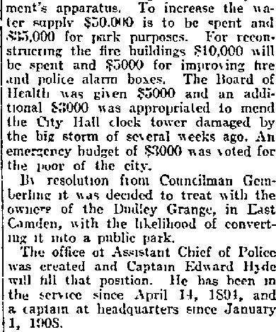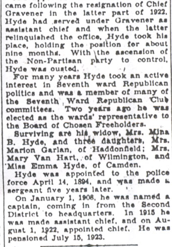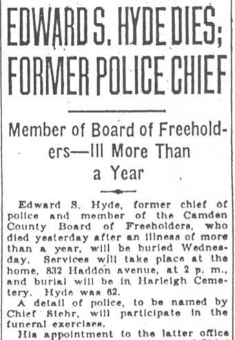 POLICE ESCORT FUNERAL OF FORMER CHIEF HYDE A police motorcycle squad under the command of Inspector Humes acted as escort today at the funeral service of Edward S. Hyde, former police chief and a. member of the board of freeholders, who died Sunday. Services took place at the home, 832 Haddon Avenue, and burial was in Harleigh Cemetery. Members of the police detail were Sergeant jefferson kay, patrolmen Thomas Kauffman, William Moll, John Stanton, Thomas Welch and James Wilson. Hyde was appointed to the police force in April, 1894, and pensioned July, 1923. He succeeded Chief Gravenor when the latter resigned in 1922. Long interested in politics, he was elected freeholder two years ago. He is survived by his widow, Mina B. Hyde, and three daughters, Mrs. Marion Garlan, Mrs. Mary Van Hart and Emma Hyde.. |