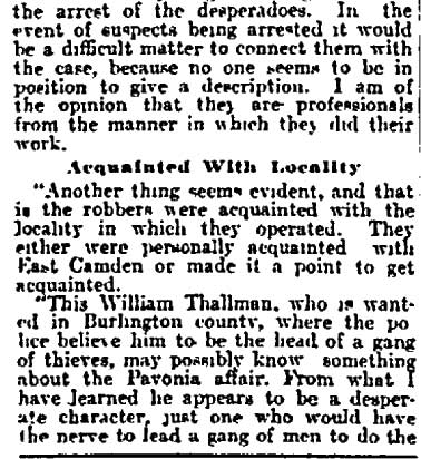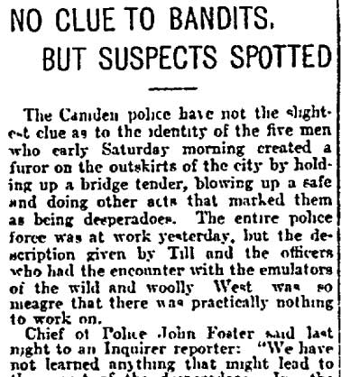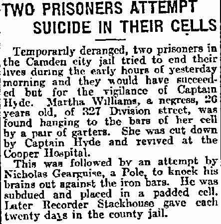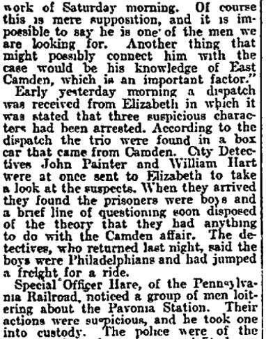With Wilson T. Ashbridge under guard in a cell in what was formerly known as Murderer’s Row, the police and county detectives today redoubled their energies towards the capture of George E. Thompson, the forger who escaped with Ashbridge from the County Jail on Monday night after murdering one keeper and wounding another. Stirring the police of all cities in the East to renewed activity, another circular was sent out today by the authorities giving notice of the reward of $500 offered for Thompson’s capture. Attention was strongly directed in the circular due to the fact that one of the fingers of Thompson’s left hand is missing. The gun with which Ashbridge murdered jailor Isaac Hibbs and wounded Jailor Ellis was smuggled into the jail by Mrs. Ashbridge on Saturday morning. With it went a box of cartridges. The weapon and bullets were passed to Ashbridge in a basket of fruit, being at the bottom of the basket. The jailors were busy at the time she called and as she frequently had brought her husband fruit they did not take precaution to search the basket. Mrs. Ashbridge bought the gun and cartridges on the written request of her husband. Her confession as to the very grave part she played in the escape and murder was made to the Prosecutor late yesterday afternoon after she had first insisted she had no knowledge if how the gun got into the jail and after her husband had repeatedly declared that the revolver was supplied by Thompson. The revolver, fully loaded, was still carried by Ashbridge when he was captured in the Keystone Hotel… … by Recorder Stackhouse without bail for conspiracy in aiding and abetting the escape of her husband and George E. Thompson from the County Jail on Monday night. The court room was packed to suffocation by a morbidly curious crowd, composed primarily of women. A strange silence spread through the court room when the little woman was led into the court room by Captain Schregler. The regular formality of placing prisoners in the dock was dispensed with the woman's case. Prosecutor De Unger pointed to the high witness chair and Mrs. Ashbridge sat in it. She evaded the gaze of the crowd, looking intently at the floor and through a window on the Washington Street side. She wore a blue skirt and a white waist. She was without her hat. her hair was carefully arranged and she wore nose glasses. Resting her chin on her right hand her arm and hand were seen to tremble slightly. So quiet was the room that a pin dropping could have been heard. "Mrs. Marian Ashbridge," called the Recorder. "Yes, Sir" was the faint reply of the woman, who did not even look up at the call of her name. "This complaint charges you with delivering to Wilson Ashbridge and George E. Thompson a pistol and aiding and abetting them in escaping from the County Jail, where they had been lawfully committed. Do you plead guilty or not guilty," said the Recorder as he read the complaint. "The woman said nothing. DetectiveSchregler was then called as the complainant. He told of the confession made by the woman and produced the revolver which the woman purchased and which Ashbridge used in his daring escape. The gun, Captain Schregler said, was purchased in a pawnshop at Eleventh and Arch Streets, Philadelphia, on Friday of last week and was delivered to Ashbridge on Saturday morning along with a box of cartridges. "Marian, I will hold you without bail,": said the Recorder. As the woman was being led from the court room by Captain Schregler and Sergeant Reed the crowd made a rush for the door leading from the court room, whereupon orders were given by the police to the crowd and many were prevented from rushing out. Everybody seemed anxious to secure a closer look at the unfortunate woman. Visitors were denied Mrs. Ashbridge. Not even her children were permitted to be brought before her, although the broken-hearted mother asked for them. "Oh, God, I don't know why I did this; why I left the little ones to go with Wilson," tearfully expostulated Mrs. Ashbridge to the kind-hearted matron, who spent the best part of last night with the distraught woman. "If I could only see little Marian," sobbed the woman in the arms of Mrs. Kirkpatrick, who informed her that perhaps she could see them today. Last eveneing the only support Mrs. Ashbridge had was a cup of tea. The morning she sipped a portion of a cup of coffee. She told Matron Kirkpatrick that she was not hungry. :Everybody hounded me, I had no friends, and that's why I went with my husband, becasue he was the only friend I had left," said Mrs. Ashbridge. "He was a good boy, but was easily led." The wife said even before her marriage that Ashbridge would run around with other girls, but he always returned to her and she forgave him. She said he seemed to have a spell over her and she couldn't leave him. "I love my husband, still and will stand by him to the end," sobbed the little woman to Mrs. Kirkpatrick. She told how her relatives disowned her and how after her father's death she went to live with strangers. When her husband fostered the plan to escape she willingly consented to aid him. She drew $100 out of the bank and purchased clothes and the gun and bullets. She never faltered in her plan. "My heart aches for that woman," said Matron Kirkpatrick this morning to a Post-Telegram reporter. "She's a good girl, but was easily led into her present predicament. It only goes to show what a woman will do for the man she loves, no matter how base a wretch he may be. Mrs. Ashbridge is more to be pitied than scorned. Recorder Stackhouse this morning produced a copy of the marriage of the couple, performed by him on July 28, 1914. The marriage was performed at the instance of Assistant Prosecutor Butler after Ashbridge wronged the girl. Constable William E. Headley and William C. Ashbridge, the latter father of the murderer, were witnesses. As told in yesterday's Post-Telegram, Ashbridge and his wife and their captors arrived at the City Hall from 