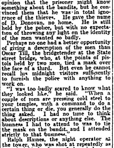 Murdering one jailor and wounding another with a revolver that had been smuggled into them by outside confederates, Wilson T. Ashbridge, slayer of Mrs. Elizabeth Dunbar, and Francis Murphy, alias George E. Thompson, a check forger, made their escape from the county jail a few minutes before seven o'clock last night. Ashbridge with his wife was caught at noon in the Keystone Hotel in Chester PA where they registered at one o'clock this morning. Thompson is still at liberty but from the confident manner of Prosecutor Kraft his early arrest seems assured. The murdered jailor was Isaac Hibbs, aged 65 years of 913 South 8th Street. The wounded keeper is Joseph Ellis, aged 45 years, of 416 Carteret Street. Shot twice, he is in Cooper Hospital. His condition today is very satisfactory. Thompson, who is 41 years old, forged a check for $650 which he gave to V.M. Fulton as part of the purchase price of an automobile. The forgery was discovered before the deal was completed and his arrest followed on June 8. he also passed a forged check for $15 on State Motor Vehicle Agent Kraft. He, too, was awaiting trial. In spite of the positive evidence against him Thompson had spurned all efforts to have him plead guilty and it is now believed that he was sparring for time while hatching a plan to escape. He s no doubt the master mind. R.L. Hunter, a farmer of Bensalem Township, Bucks County PA, about four miles above Torres dale, reported to the Philadelphia police the morning that he had seen a man answering Ashbridge's description on the Bucks Road at daylight. The man asked the way to Riegelsville. According to Hunter, the man was dressed in a dark suit, and had no hat. His clothing was wet. Hunter did not see anything suspicious in his actions, and after giving him directions, they parted. Upon seeing the paper with a picture of Ashbridge, the farmer was struck by its resemblance to the man with whom he had talked. He hurried to Tacony and notified the police. The State police, who patrol that section of the county, and who have an office at Langhorne, were immediately notified as were the surrounding towns. The shootings took place in different parts of the jail. Hibbs was murdered in the exercise room just outside the cell room on the Sixth and Arch corner of the building. Ellis was shot down in the corridor just outside the Market Street end of the building when he heroically grappled with Ashbridge after the latter had pointed a gun at his head. In spite of his wounds Ellis dragged himself to a telephone and after notifying Police Headquarters of what had happened he collapsed. Only one of the two bullets is still in Ellis. It entered the groin on the right side and is buried in the muscles of the leg, having taken a downward course for seven or eight inches. The other bullet struck Ellis in the right breast and came out in the left breast, traversing the upper fleshy parts of the body. Hibbs was almost instantaneously killed by a bullet that went within an inch of his heart, producing a hemorrhage. The bullet was extracted this morning from the body early this morning in an autopsy performed at the morgue by County Physician Stem. In spite of the fact that it is pretty well established that three shots were fires in the attack on Hibbs, only one of the bullets took effect. "But it makes little difference which of the two men handled the gun" said Prosecutor Kraft this morning. "Both are equally guilty of this murder and what we are concerned about now is the recapture of the gunmen." Mr. Kraft added that it his purpose to examine all of the prisoners in that part of the jail where Hibbs was murdered to determine fully who fired the fatal shot. The escape had been carefully planned and timed to the minute. Of course the desperate prisoners were aided by confederates on the outside and it is the general belief that a high powered motor car was in waiting for them not far from the jail. They are known to have been in possession of money and openly boasted yesterday that it was their intention to leave the prison last night. These boasts were made to two young ladies connected with a religious organization who called on the tom men yesterday to offer spiritual reconciliation. The girls are frequent visitors to the jail and naturally their efforts at evangelization were directed in the main toward Ashbridge, because of the fact that he was accused of murder. These girls, whose identity officials will not disclose, were closeted with Prosecutor Kraft until one o'clock this morning. Both declared that on their visit yesterday they were told by Ashbridge and Thompson that it was the last day they expected to spend in jail. "We are going to get away from here tonight and we've got money to help us after we are out " said Ashbridge, who further told the girls he had considerable cash sewed up in the waistband of his trousers. The girls begged the prisoners not to do anything that would cause them more trouble and they told the Prosecutor that Ashbridge and Thompson promised them that they would not make any effort to escape. In their talks with the girls neither of the prisoners said a word that would indicate that they would kill if necessary to escape. The full force of their boast did not dawn on the religious workers and for this reason it never occurred tot hem to inform the Sheriff of what the prisoners had in said. A general jail delivery of at least all the men confined in hat is known as the untried department, where the two were held, was only averted by the prompt arrival of the police on their beat, which was made easy by means of the keys taken from the prostrate body of Hibbs. Ashbridge and Thompson left all of the doors open and the vanguard of the inrushing police found the prisoners swarming all over the corridors on the east side of the prison. In the wild excitement following the double shooting and escape none else thought of freedom and a checking up of the inmates after they had been h