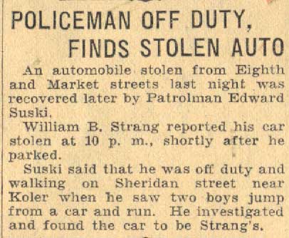 EDWARD T. SUSKI was born in Pennsylvania around 1900, the son of Thomas and Elenora Suski, Polish immigrants who had come to America from what was then Austria-Hungary shortly before his birth. The Suski was living in Philadelphia when the Census was taken in 1910. Besides Edward and his parents the family included older siblings Florence, Stefina, and Stanley, along with younger sisters Helen and Marion. The family came to Camden at some point after the 1914 Camden City Directory was compiled. The 1919 Directory and 1920 Census both show Thomas Suski and his family living at 1165 Thurman Street in the Whitman Park neighborhood. Edward Suski joined the Camden Police Department on July 1, 1928. Still a bachelor in April of 1930 when the census was enumerated, he was then renting a room at 1272 Thurman Street from John and Mary Smiglewski. Edward T. Suski married in the early 1930s. His his wife Steffy A. Suski bore a son, Edward Suski Jr. in 1935. The Suskis were living at 1320 Jackson Street in the late 1930s and into 1943. By 1947 Edward Suski and his family were living at 1318 Jackson Street. He had by this time been promoted to Detective. He was still living at that address as late as 1977. His son, Edward T. Suski Jr., practiced law in Camden for many tears, with offices in the 100 block of North 7th Street. Steffy Suski passed away in Absecon NJ on Christmas Day, December 25, 199 2. In the mid-1940s Edward Suski served as vice-president of the Camden Police Beneficial Association. Other officers were Vincent Conley, Archie Reiss, Edward Carroll and John B. Stanton. |