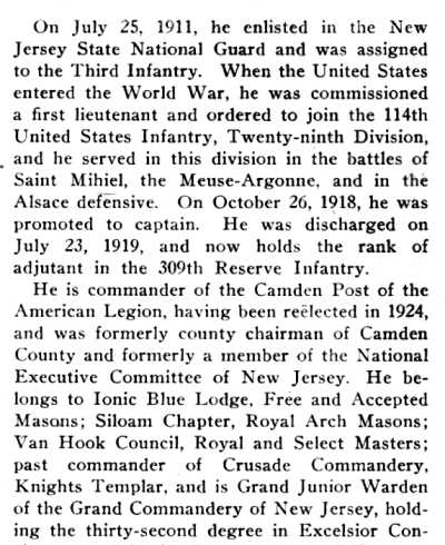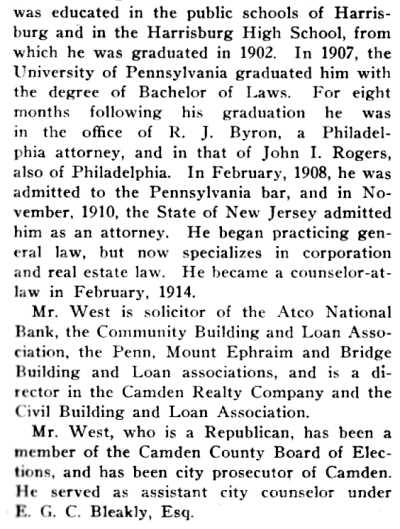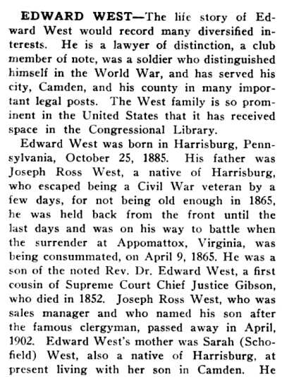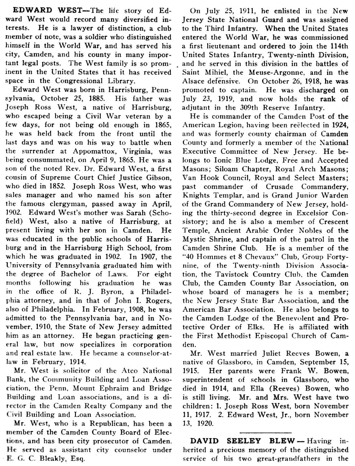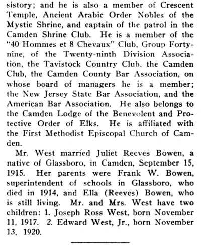 EDWARD WEST was a well-known lawyer in Camden. He served as assistant city counselor under E.G.C. Bleakly, was a member of the county Board of Elections, and was active in Masonic and fraternal affairs. A member of the National Guard before America's entry into World War I, he saw combat at St. Mihiel, the Argonne Forest, and in the defense of Alsace late in the war. He was very active in veterans affairs after the war with the American Legion and other groups.